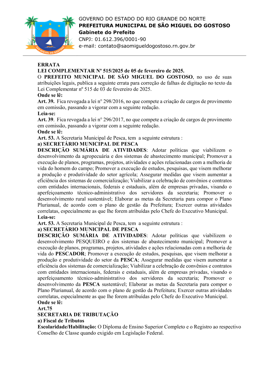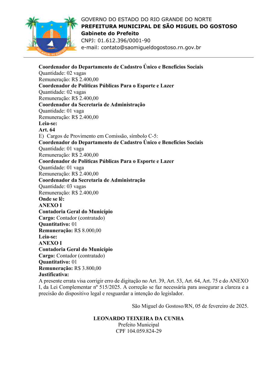 RETIFICAÇÃO - ERRATA DA LEI 515/2025