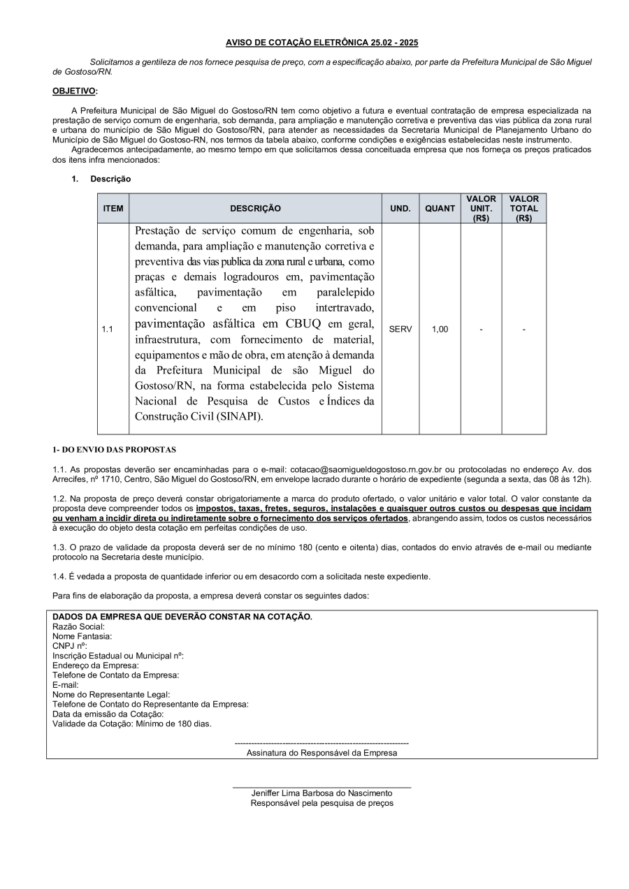 AVISO DE COTAÇÃO ELETRÔNICA 25.02 - 2025