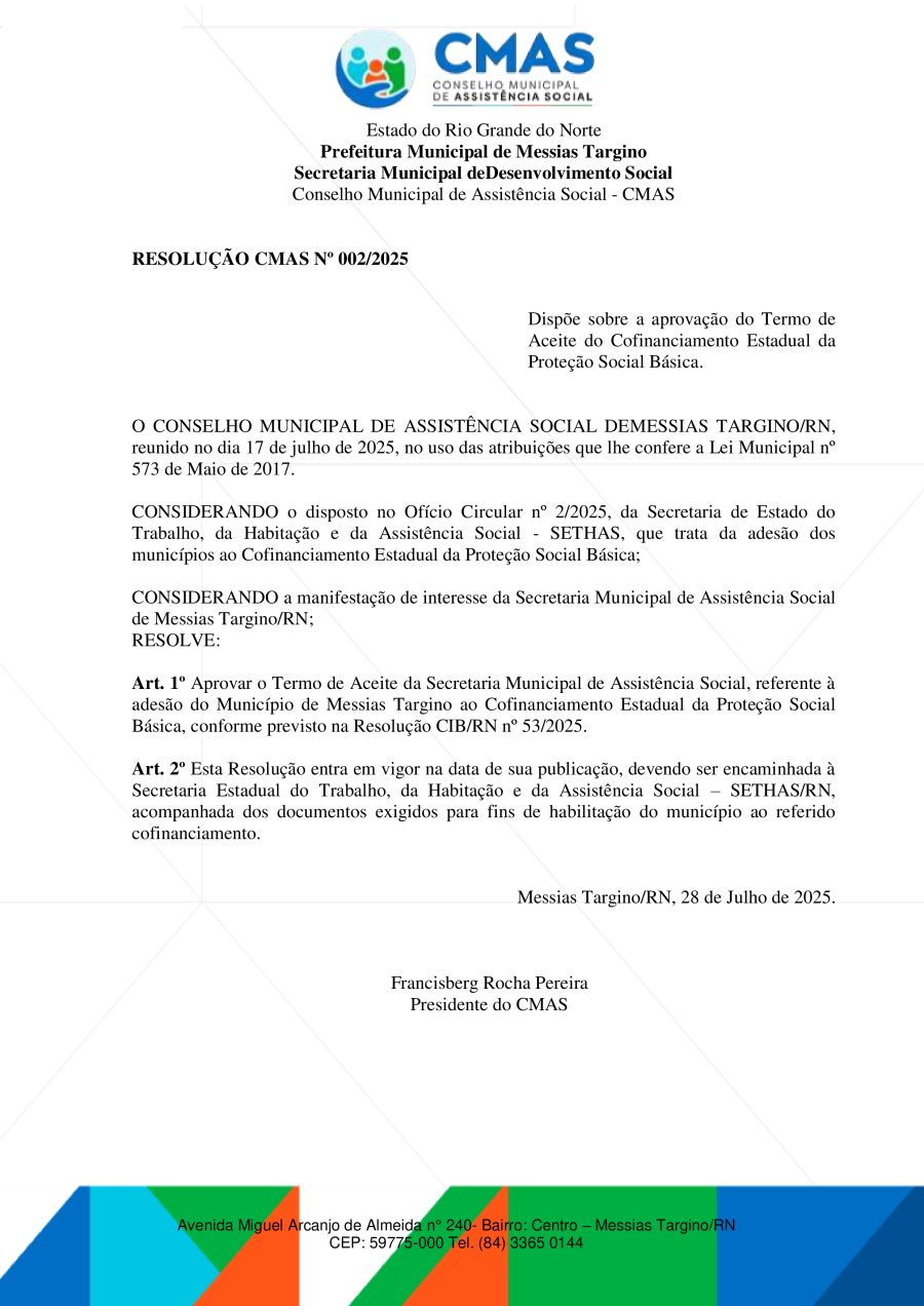 RESOLUÇÃO CMAS Nº 002/2025 - aprovação do Termo de Aceite do Cofinanciamento Estadual da Proteção Social Básica