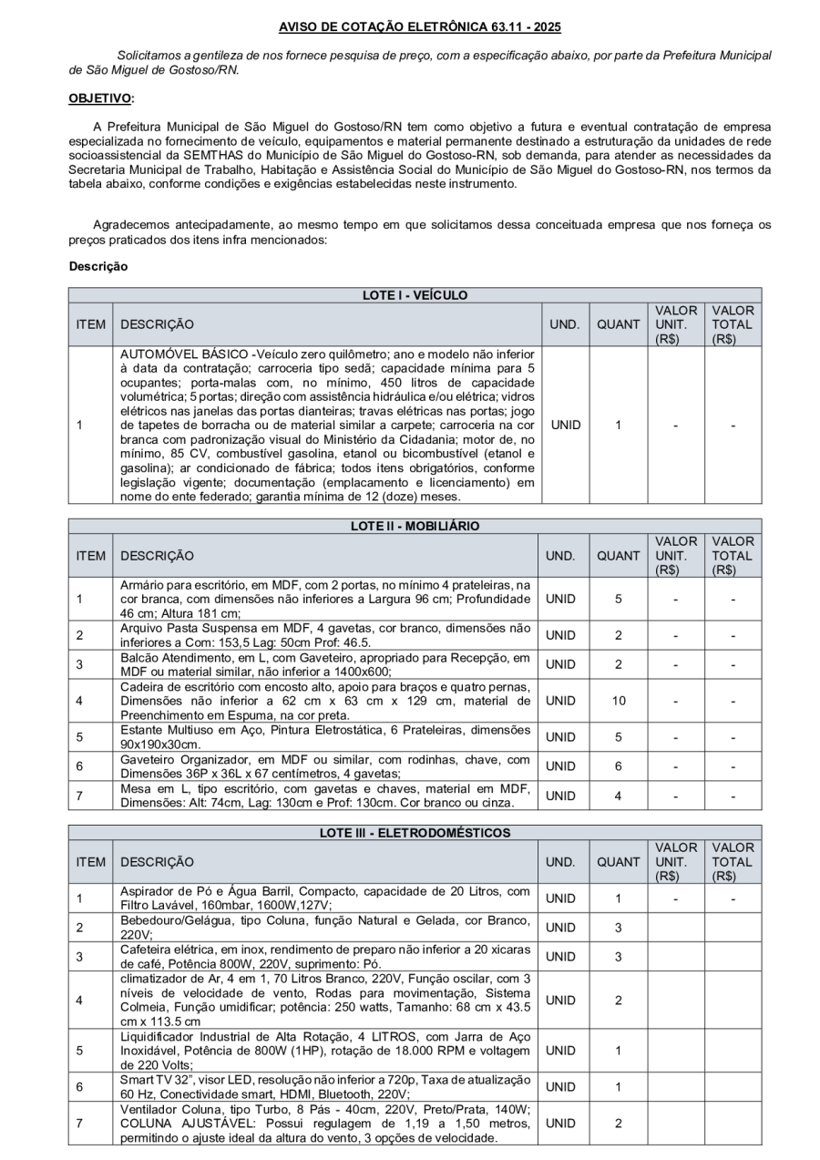 AVISO DE COTAÇÃO ELETRÔNICA 63.11 - 2025
