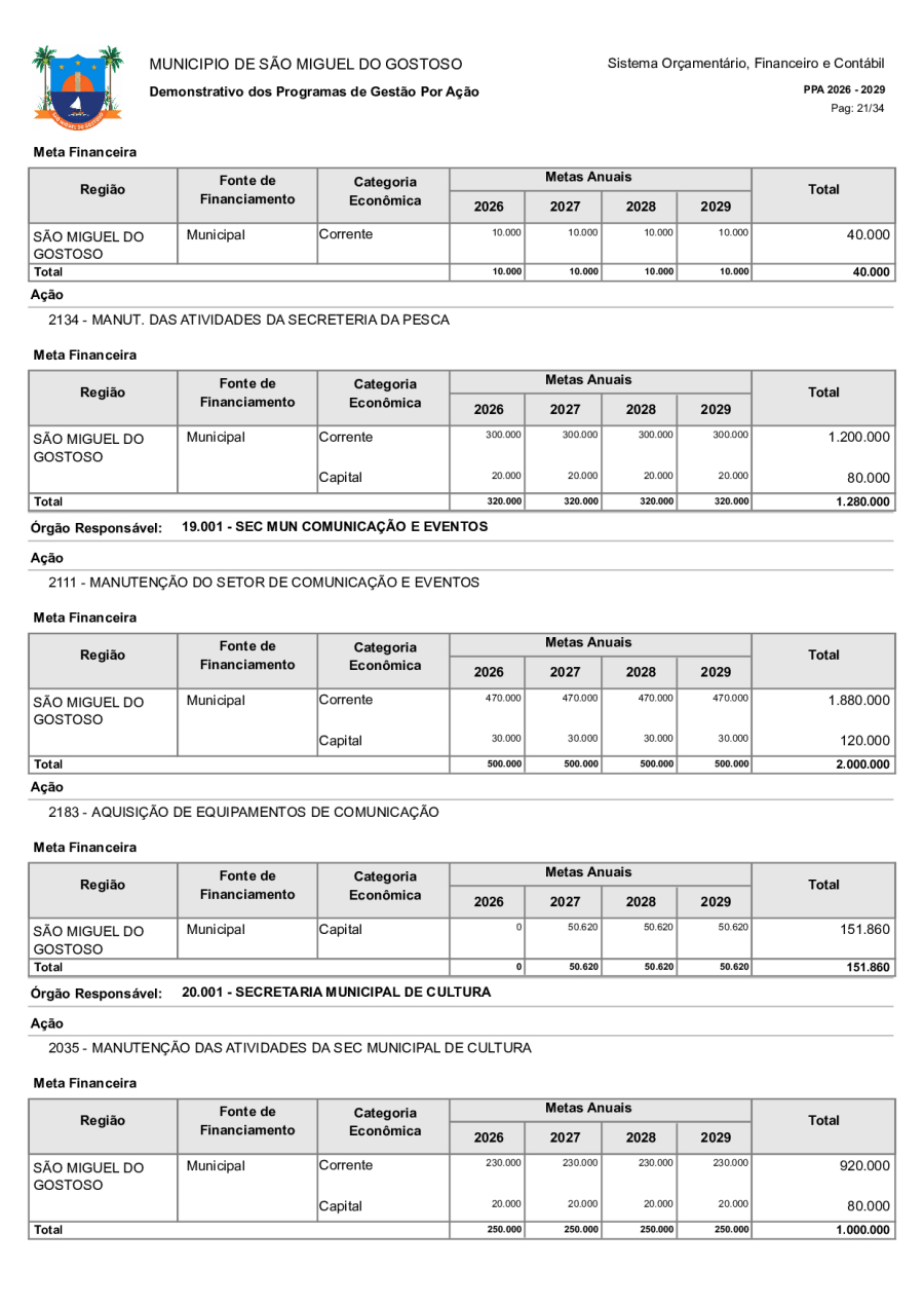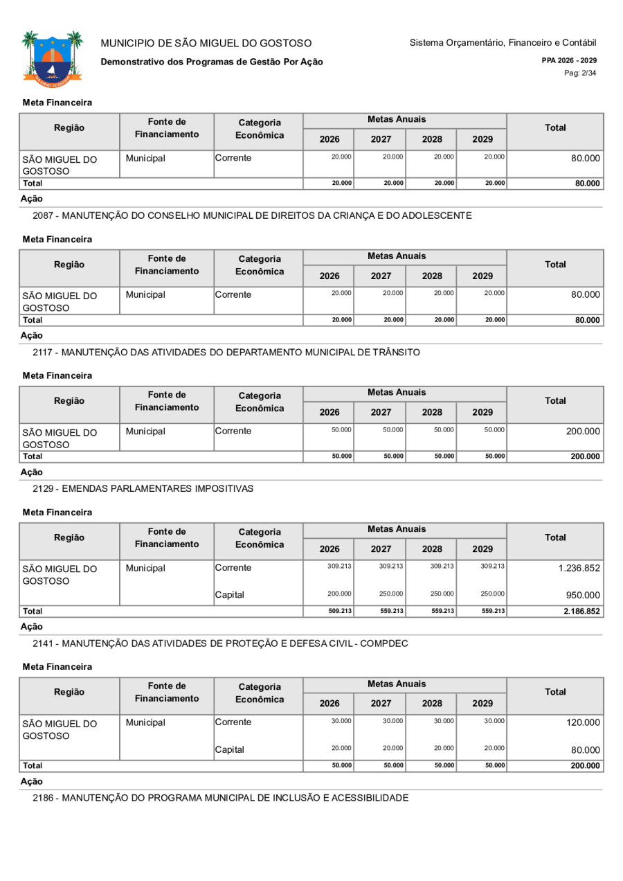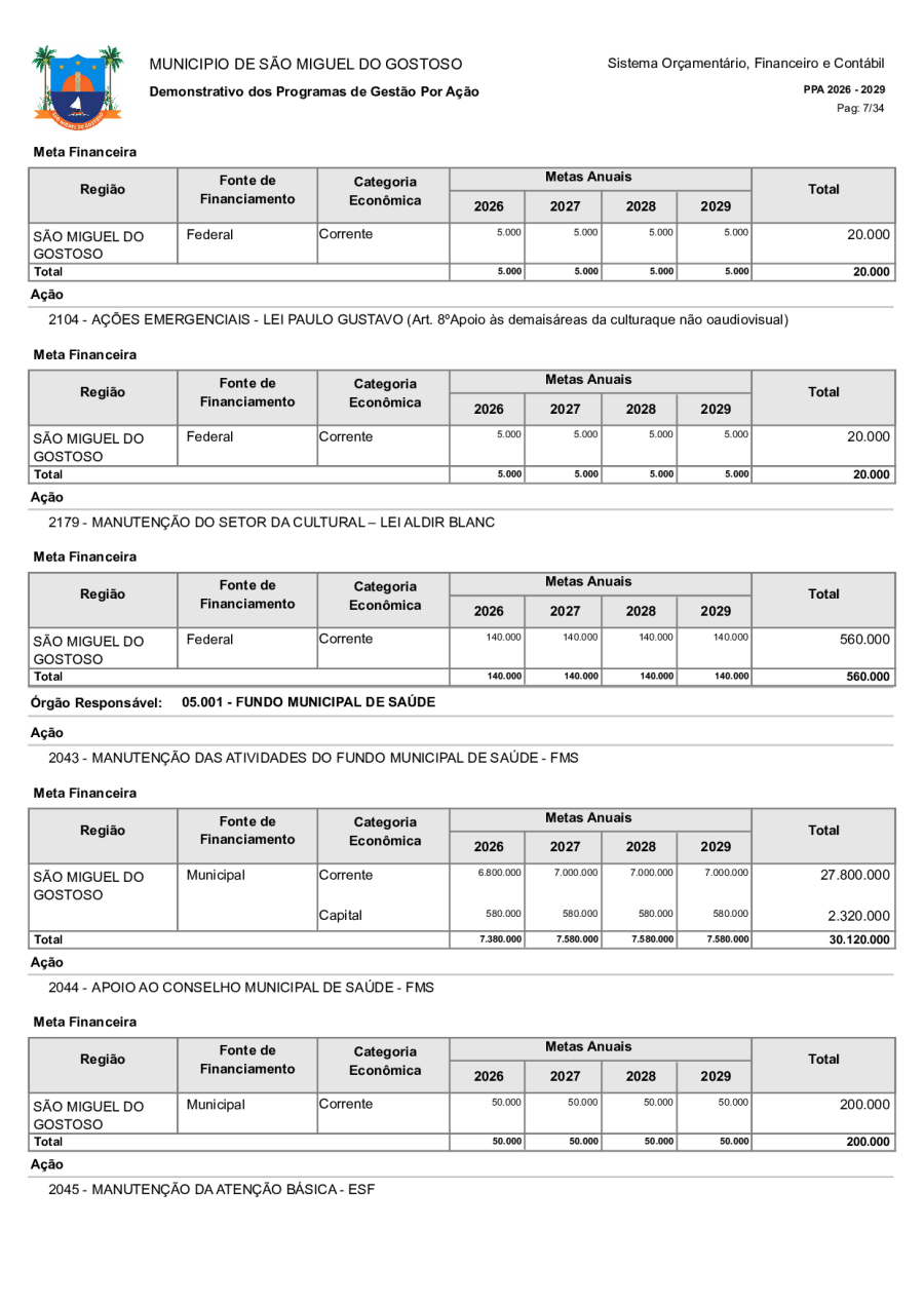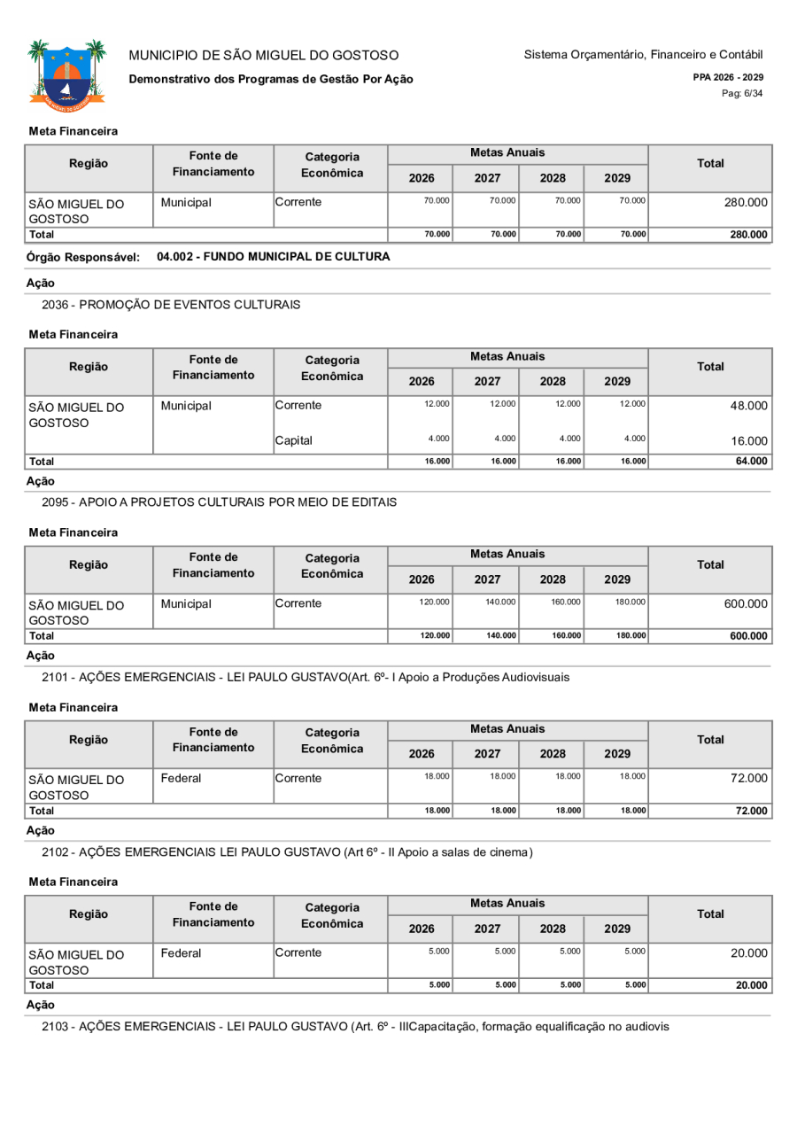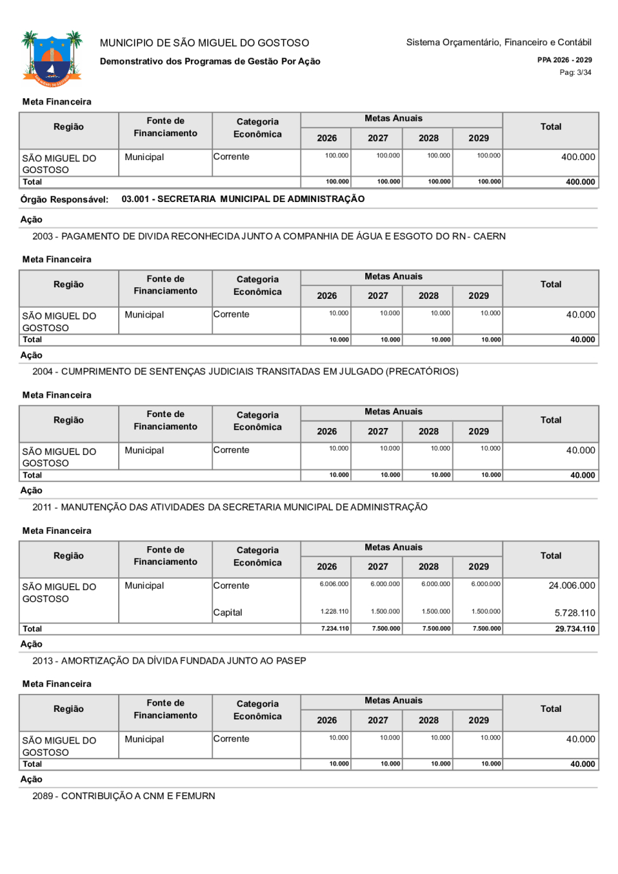 LEI MUNICIPAL Nº. 541/2025 - ANEXO III - PPA -Demonstrativo dos Programas Gestao - Acao