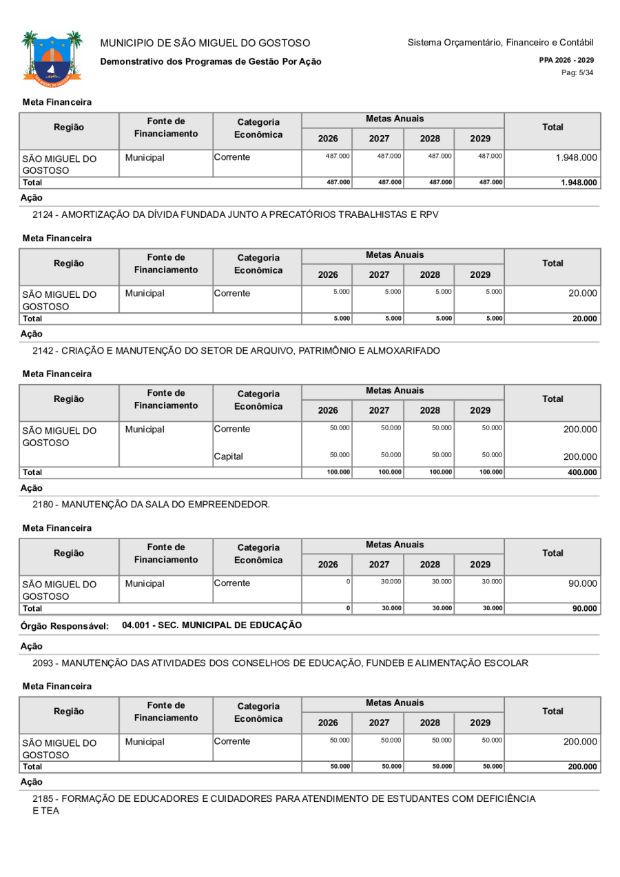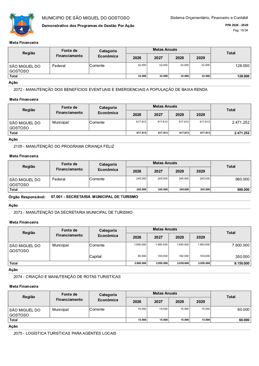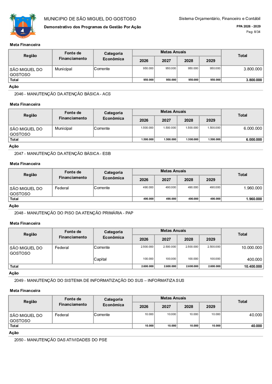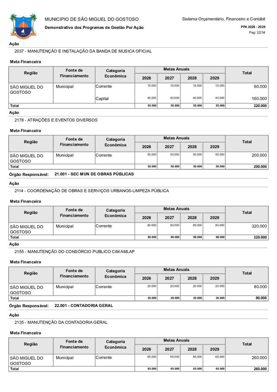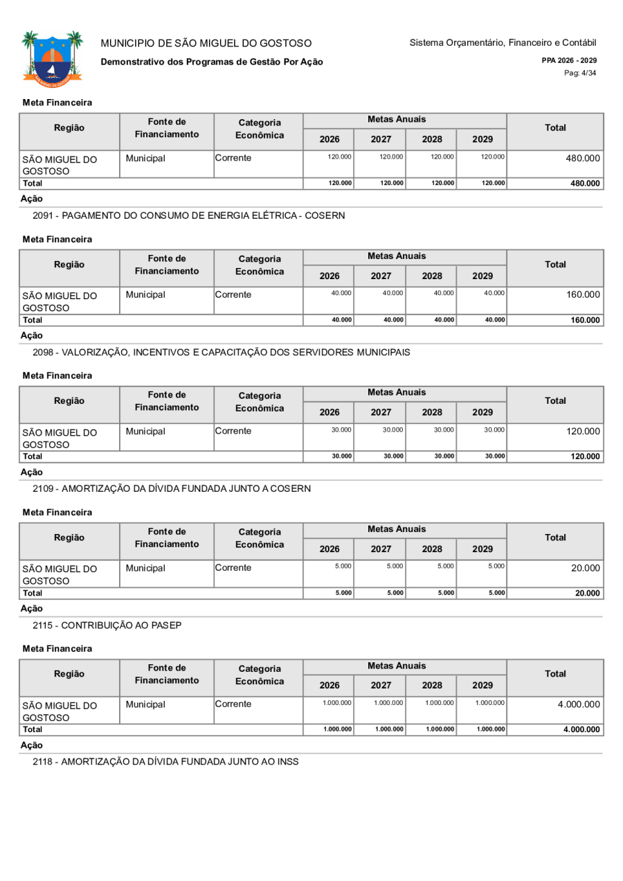 LEI MUNICIPAL Nº. 541/2025 - ANEXO III - PPA -Demonstrativo dos Programas Gestao - Acao