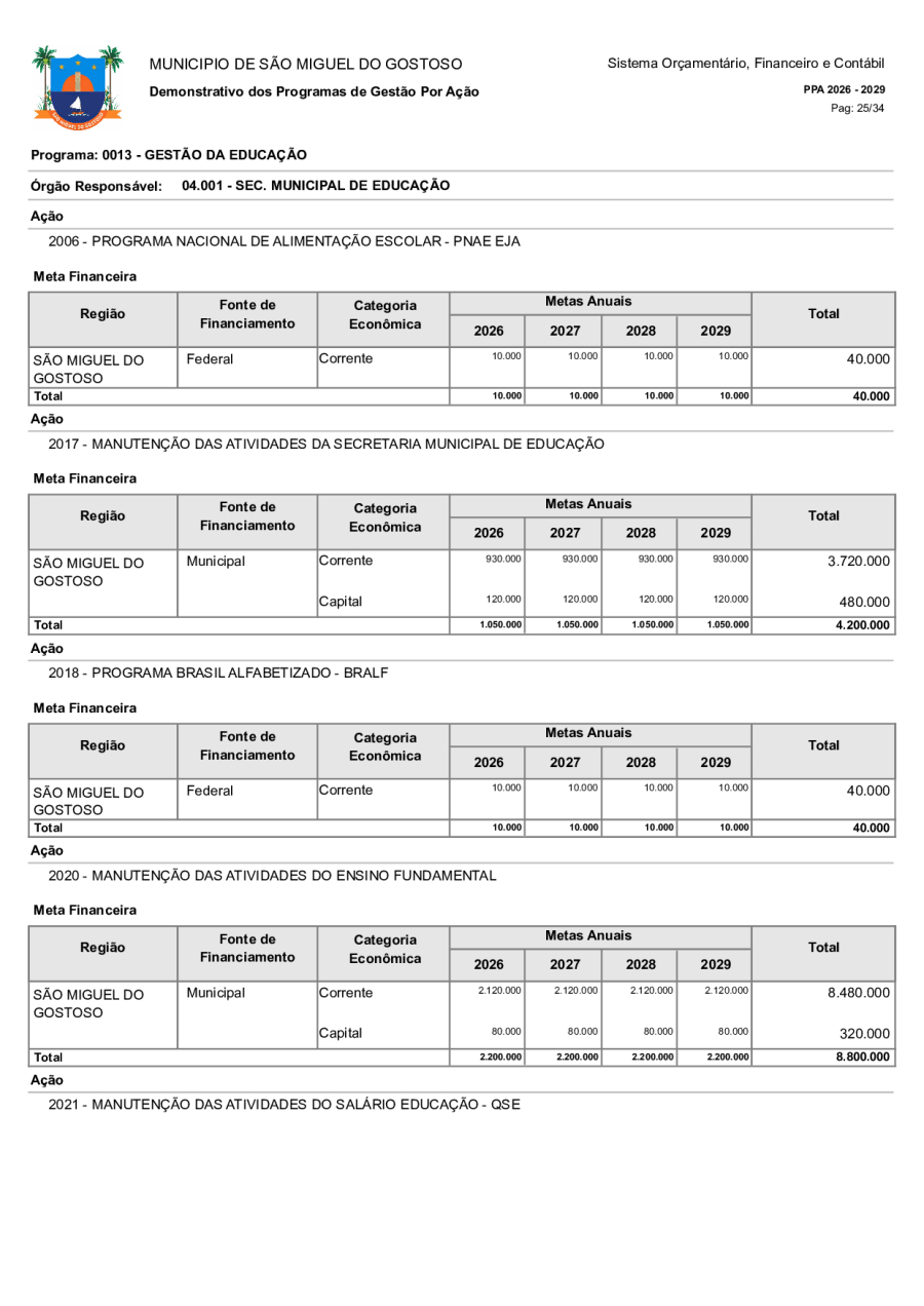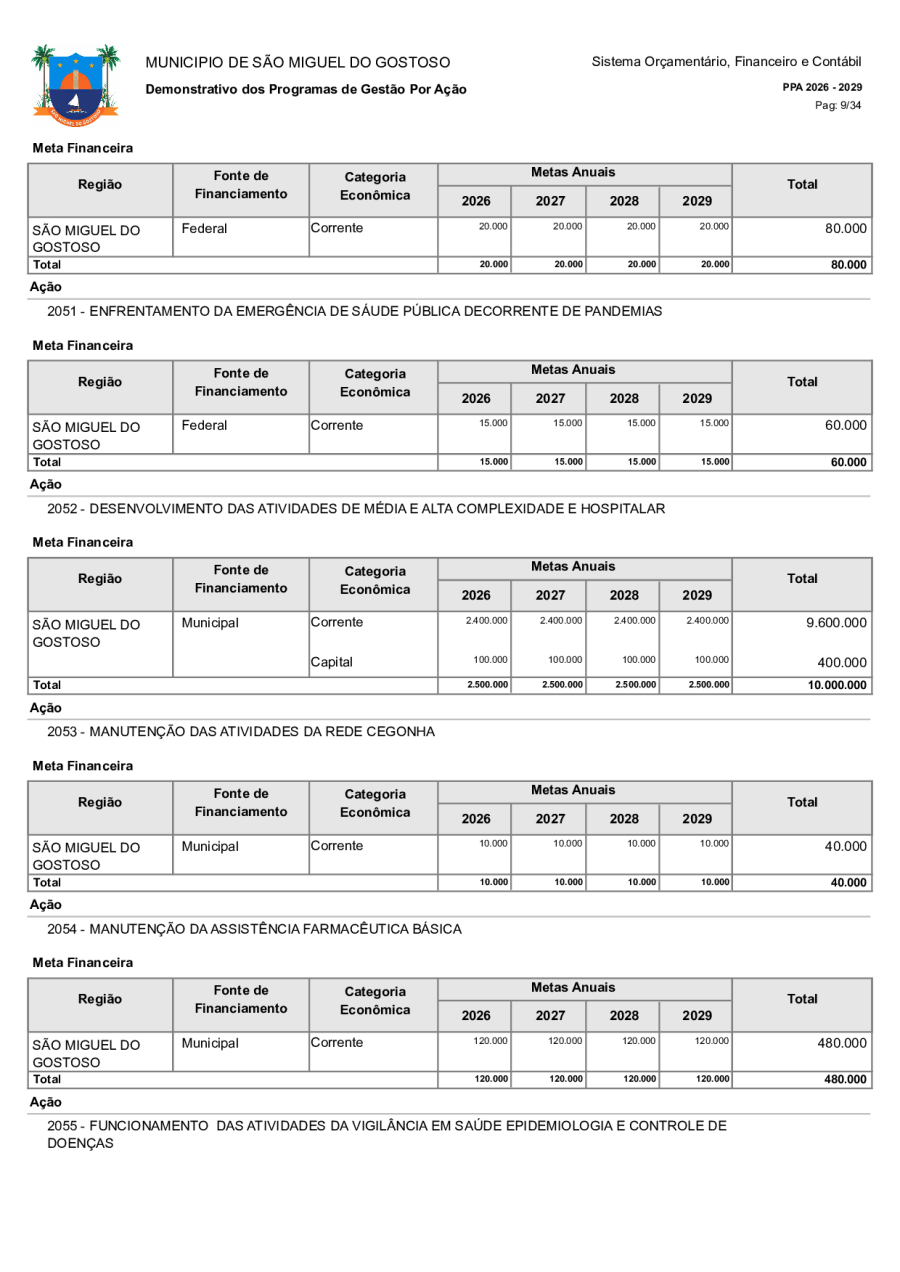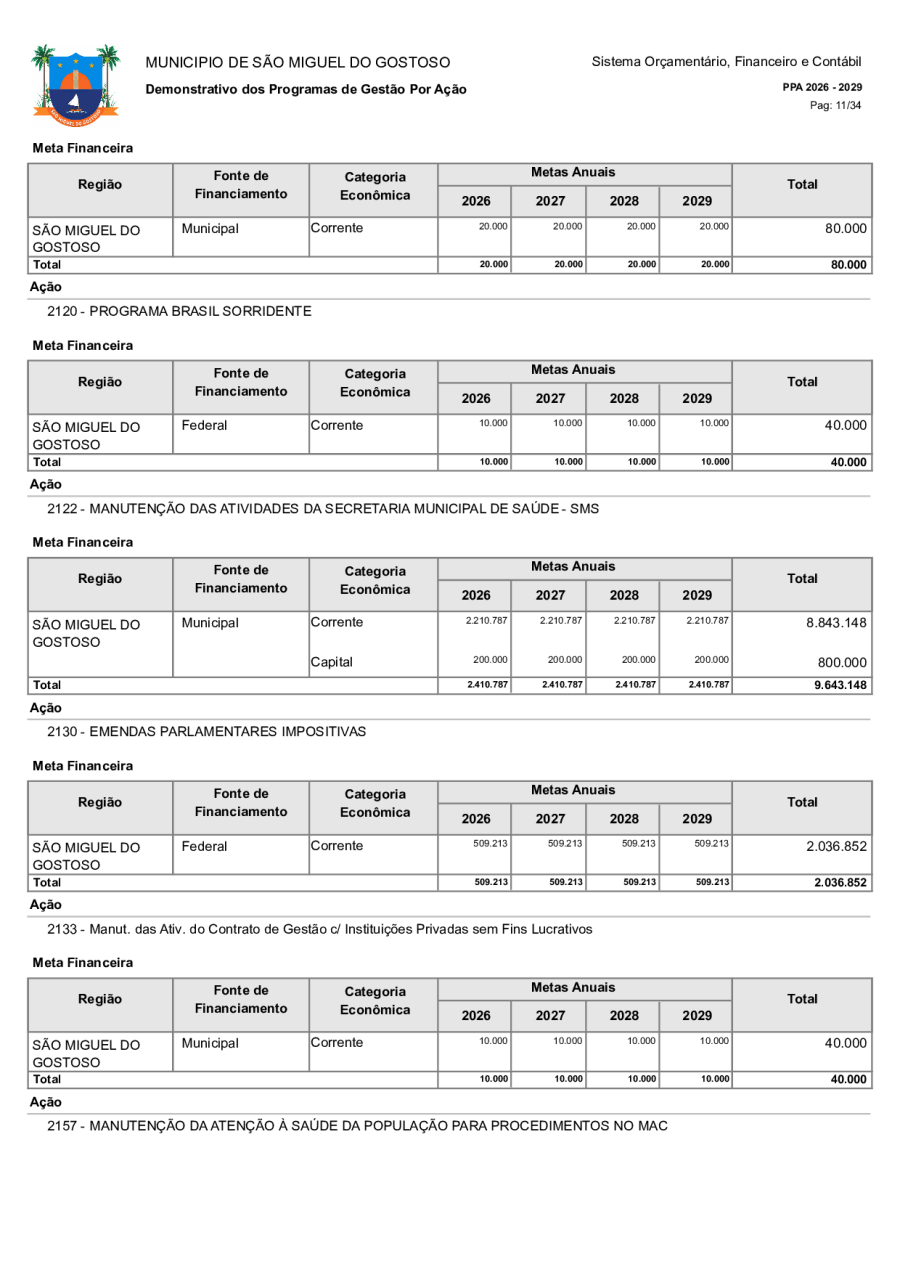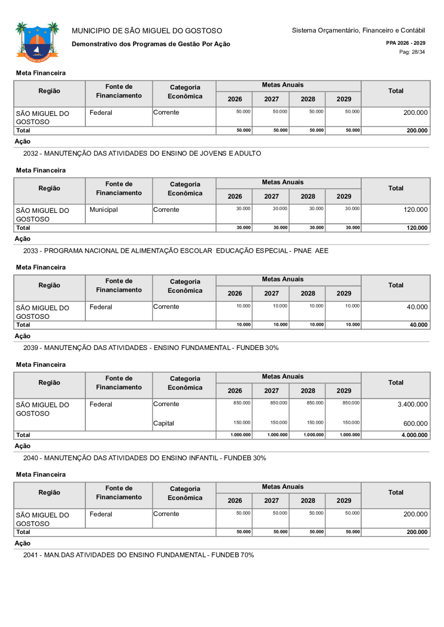 LEI MUNICIPAL Nº. 541/2025 - ANEXO III - PPA -Demonstrativo dos Programas Gestao - Acao