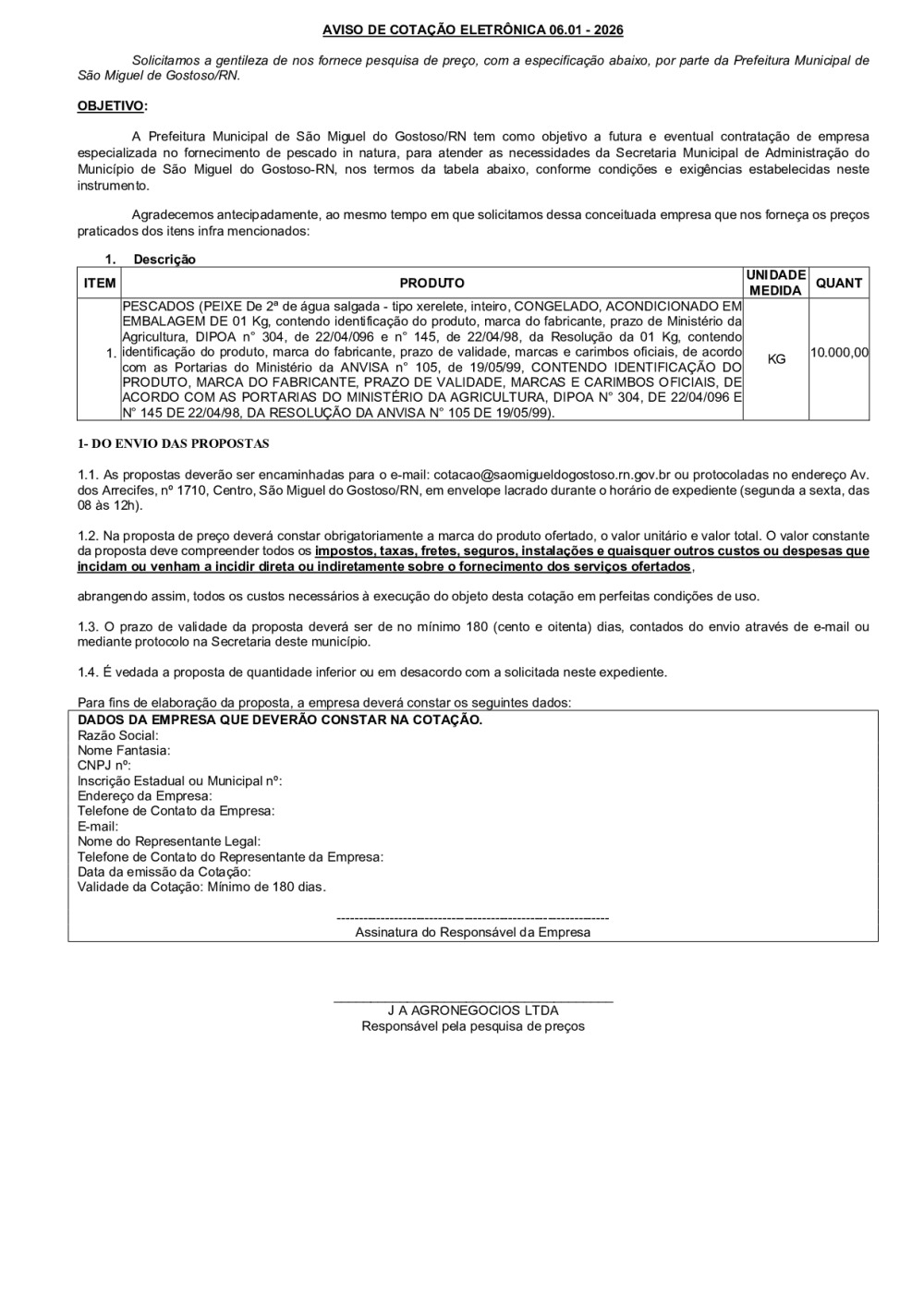 AVISO DE COTAÇÃO ELETRÔNICA 06.01 - 2026
