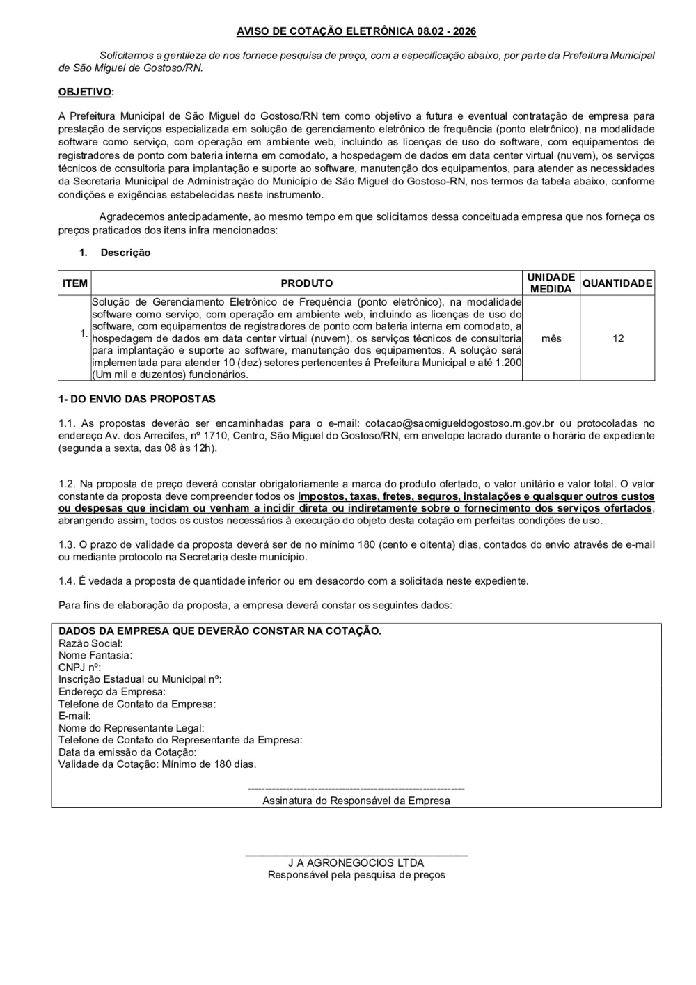 AVISO DE COTAÇÃO ELETRÔNICA 08.02 - 2026