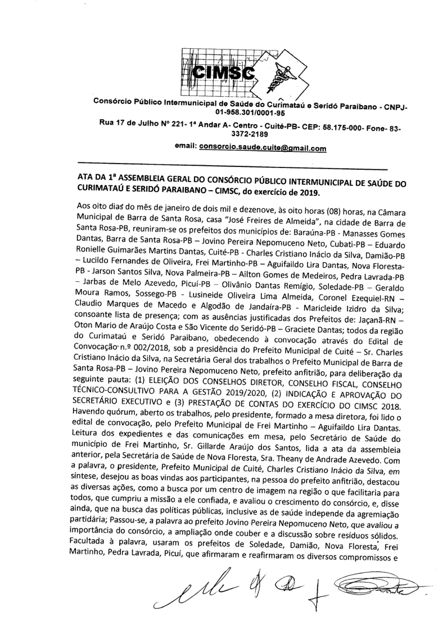 ATA DA 1º ASSEMBLÉIA GERAL - 08 DE JANEIRO DE 2019