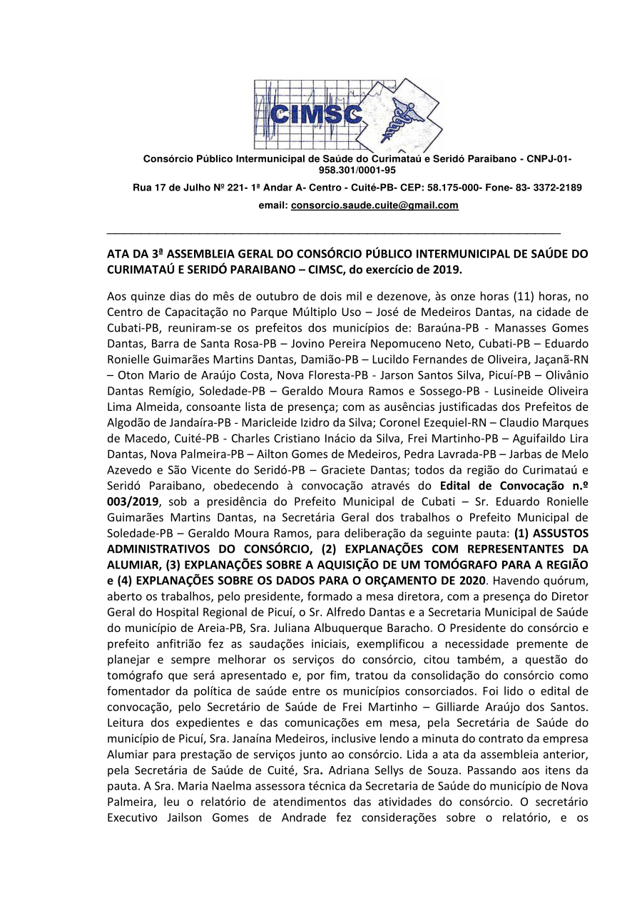 ATA DA 3º ASSEMBLÉIA GERAL - 15 DE OUTUBRO DE 2019