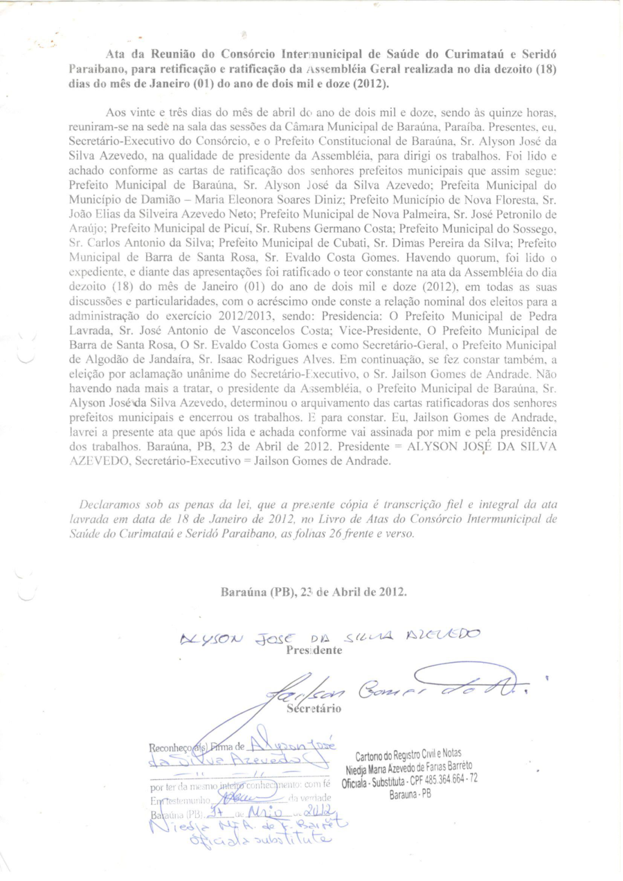 Conforme MP n° 2.200-2 de 24/08/2001, que institui a infraestrutura de chaves Públicas. Matéria Publicada no Diário Oficial do Consórcio Intermunicipal de Saúde do Curimataú e Seridó Paraibano/PB no dia - Edição .