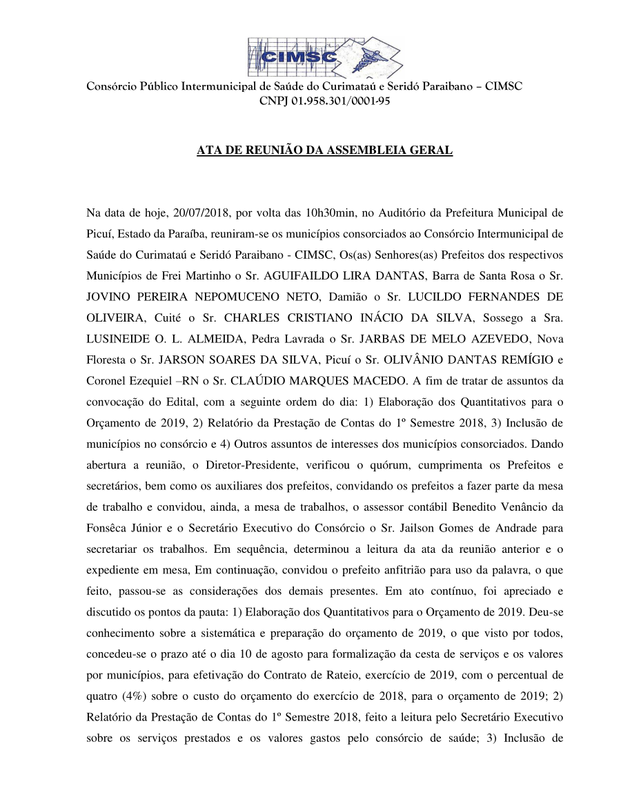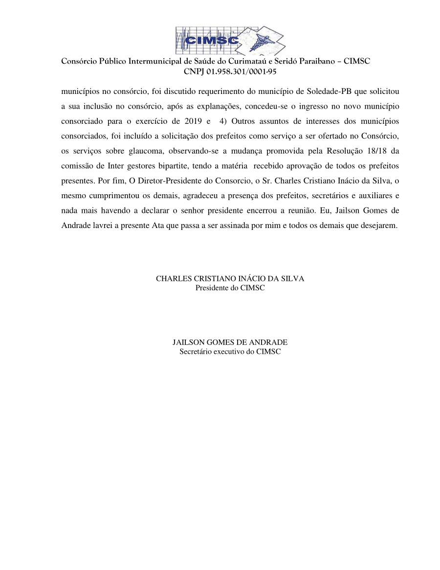 Conforme MP n° 2.200-2 de 24/08/2001, que institui a infraestrutura de chaves Públicas. Matéria Publicada no Diário Oficial do Consórcio Intermunicipal de Saúde do Curimataú e Seridó Paraibano/PB no dia - Edição .