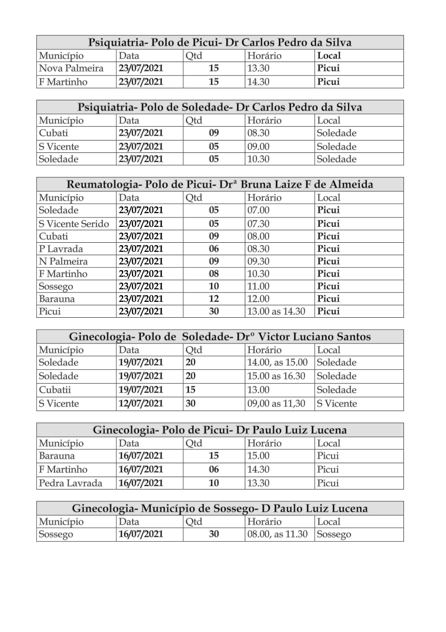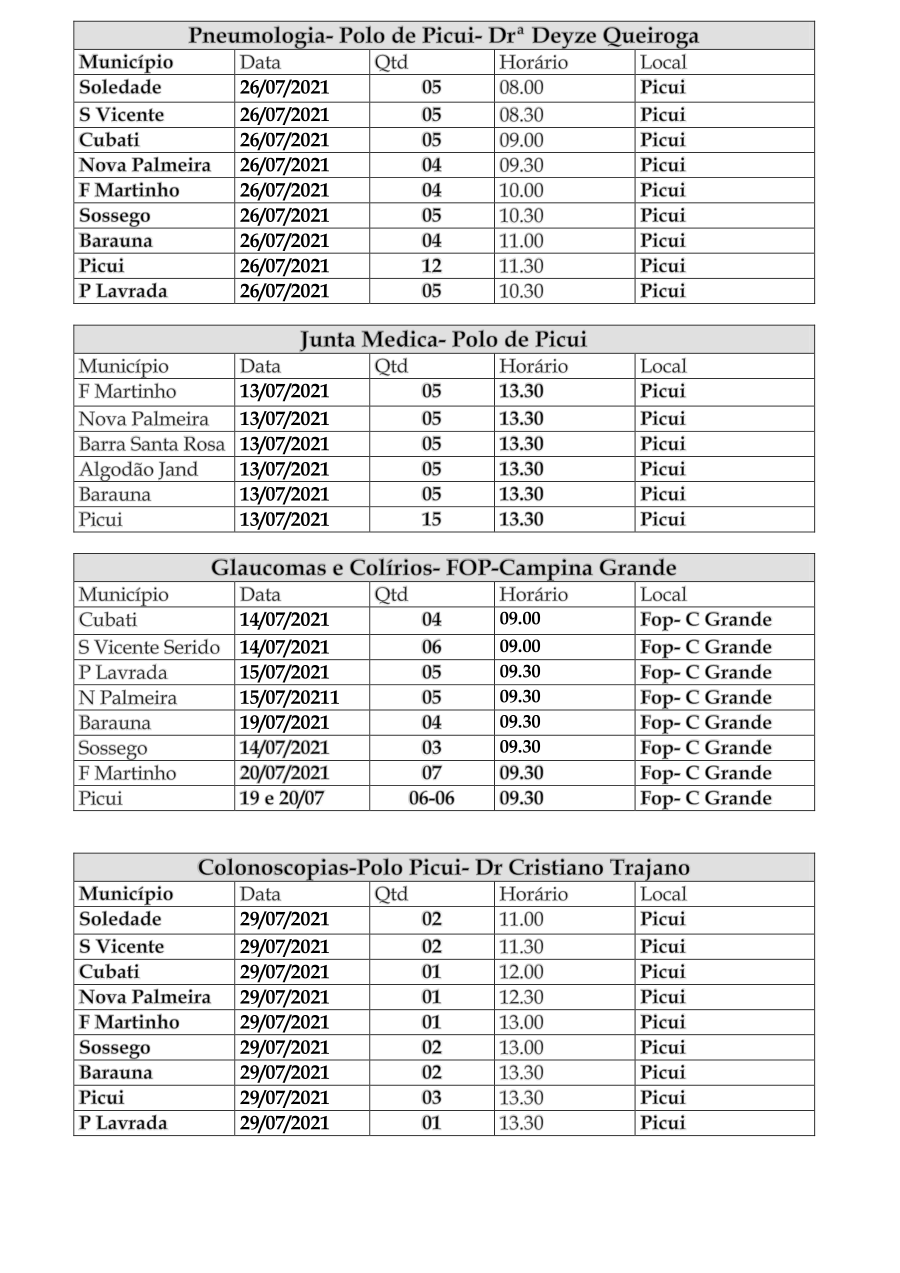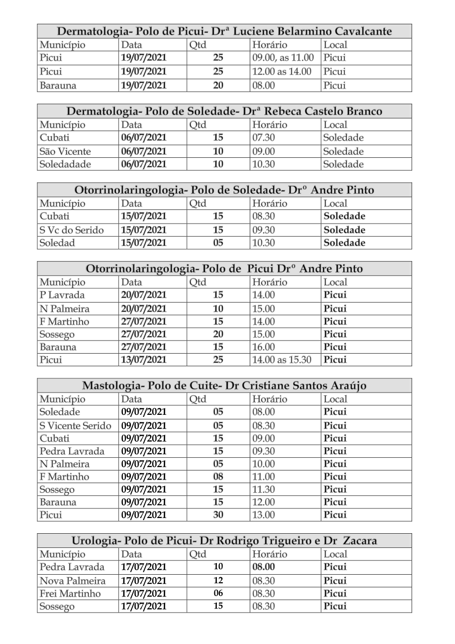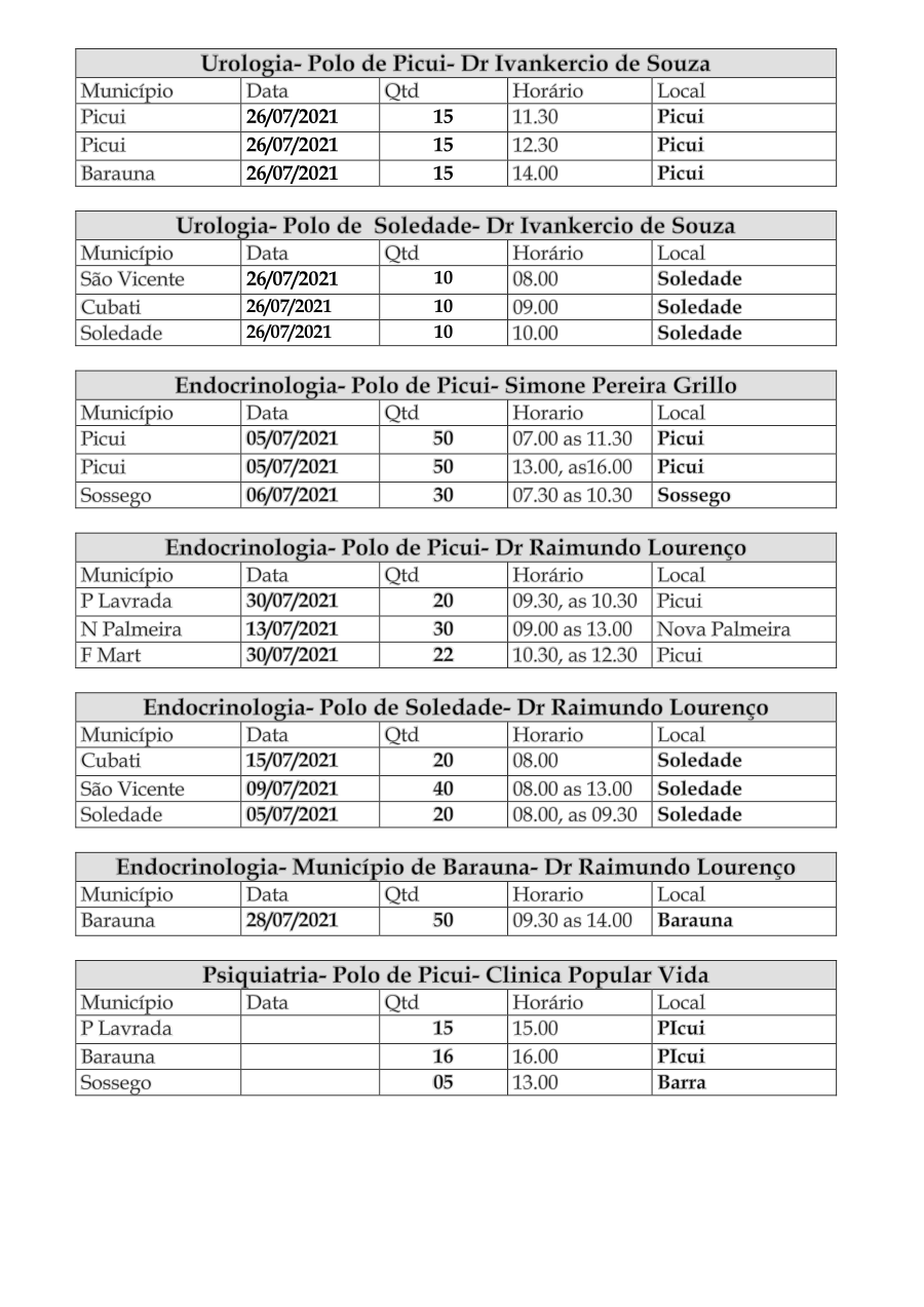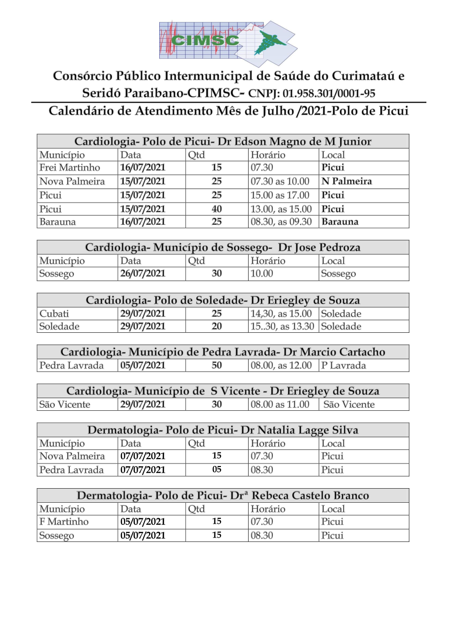 CALENDÁRIO DE ATENDIMENTO DO MÊS DE JULHO DE 2021 - POLO DE PICUÍ