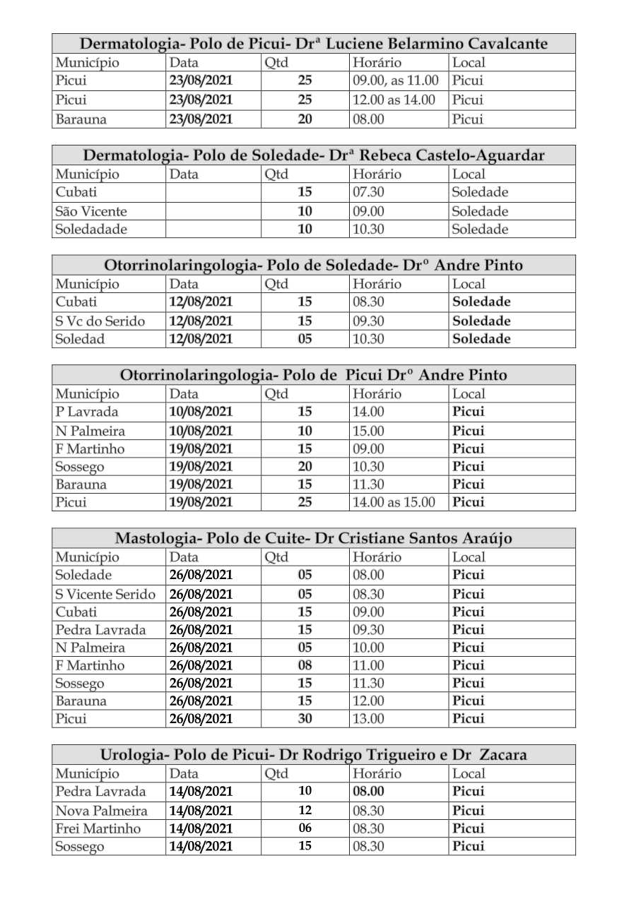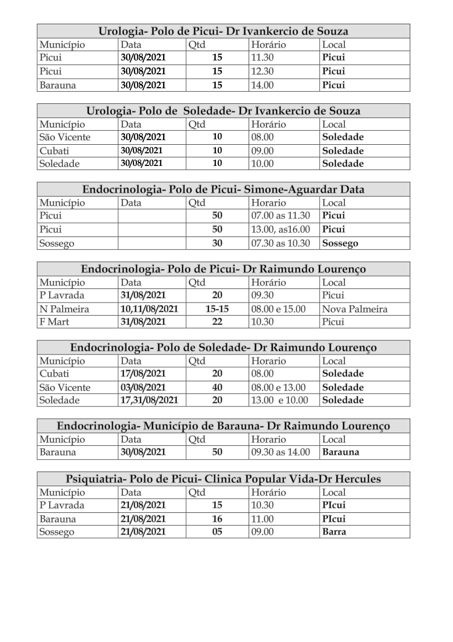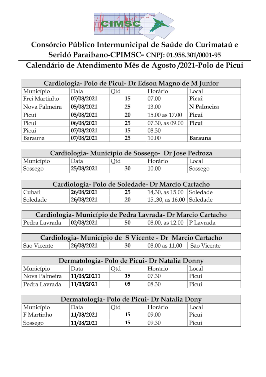 CALENDÁRIO DE ATENDIMENTOMÊS DE AGOSTO 2021 - POLO DE PICUÍ