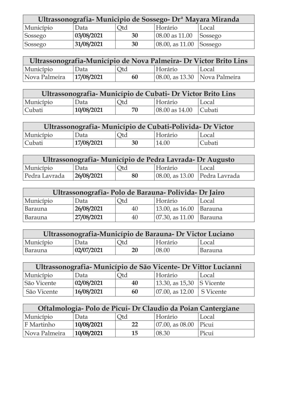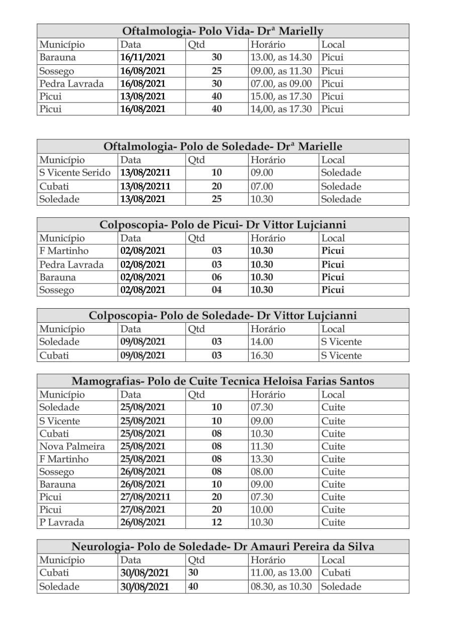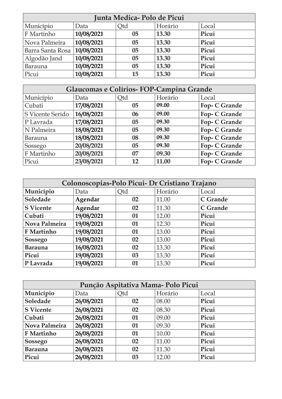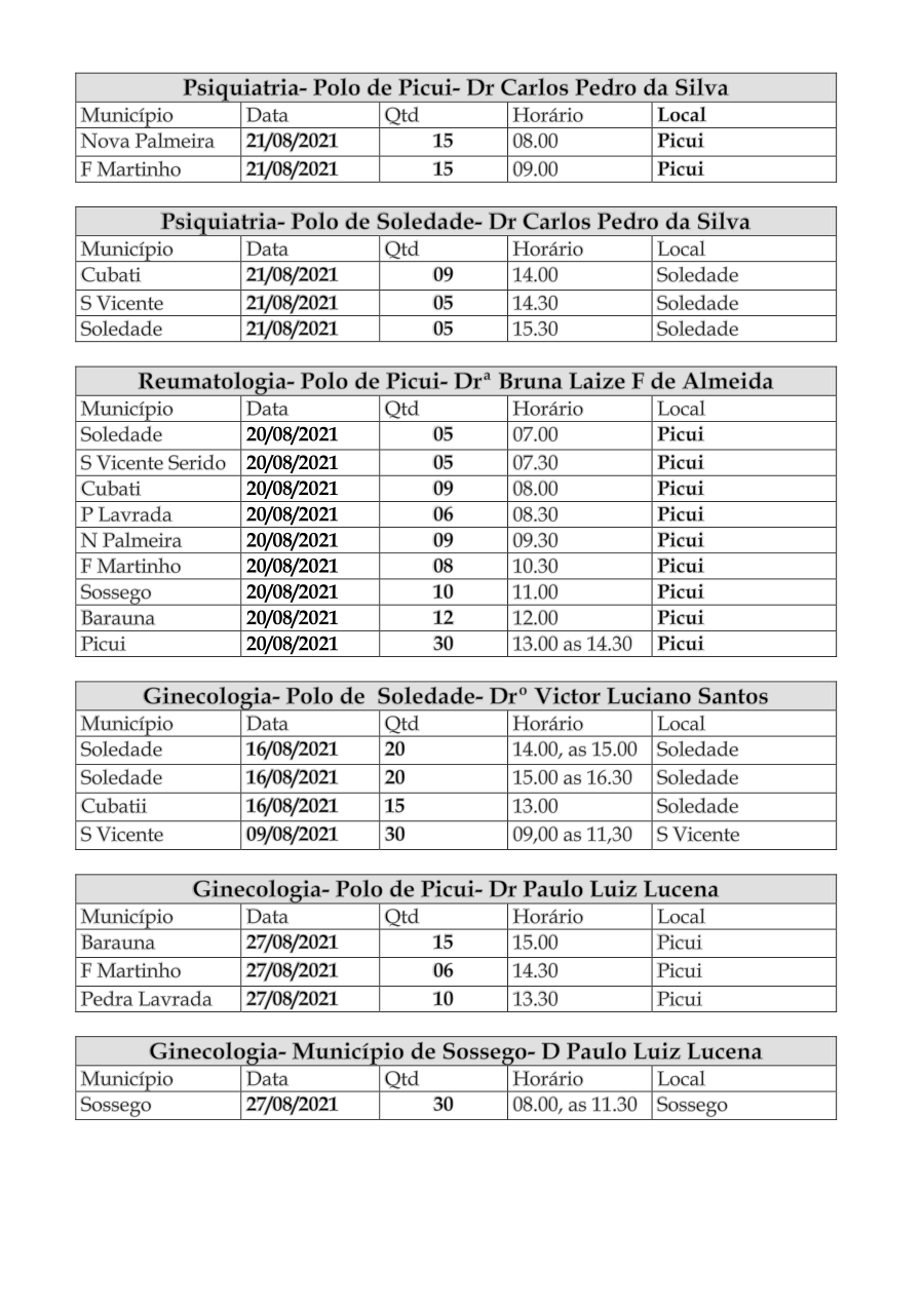 CALENDÁRIO DE ATENDIMENTOMÊS DE AGOSTO 2021 - POLO DE PICUÍ