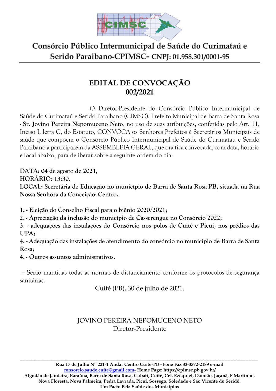 Conforme MP n° 2.200-2 de 24/08/2001, que institui a infraestrutura de chaves Públicas. Matéria Publicada no Diário Oficial do Consórcio Intermunicipal de Saúde do Curimataú e Seridó Paraibano/PB no dia - Edição 00294.
