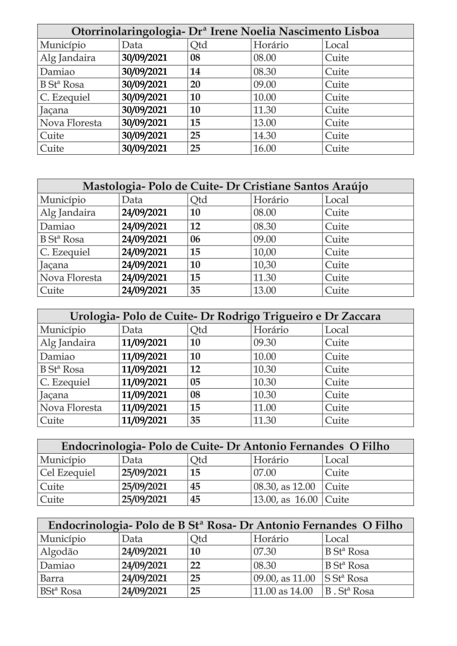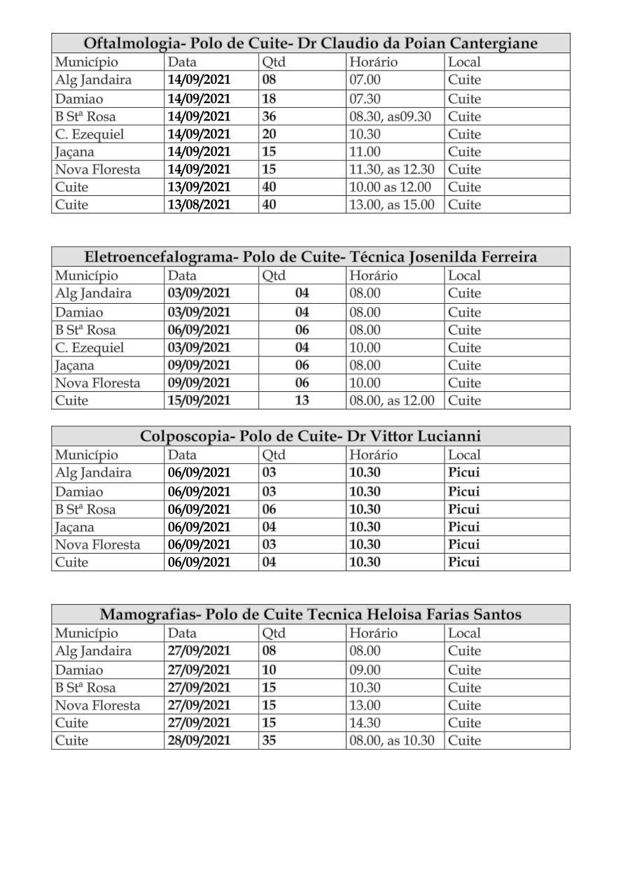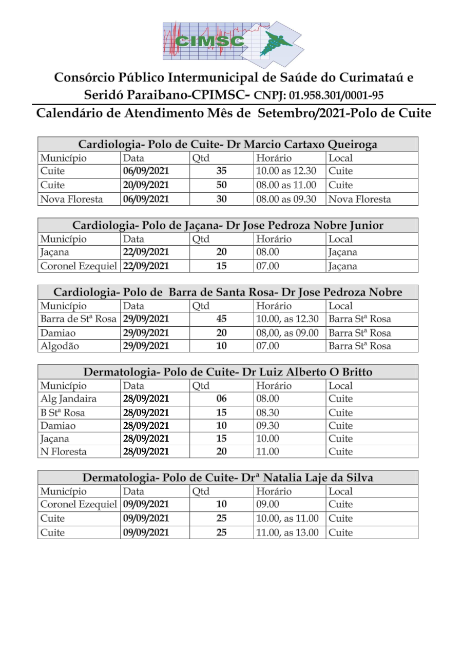 CALENDARIO DE ATENDIMENTO MÊS DE SETEMBRO DE 2021 - POLO CUITÉ