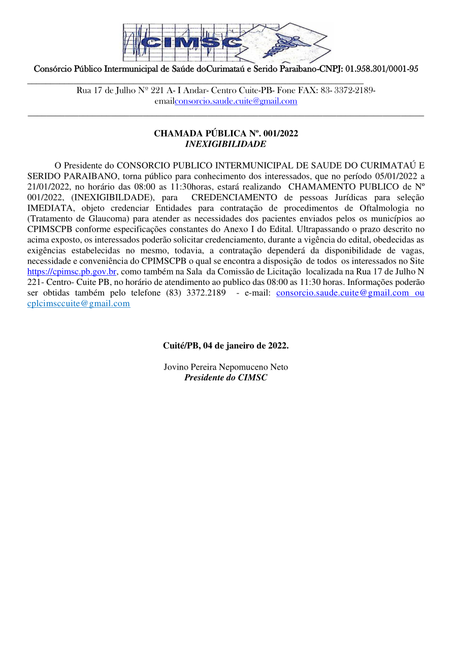 CHAMADA PÚBLICA N° 0001/2022 INEXIGIBILIDADE