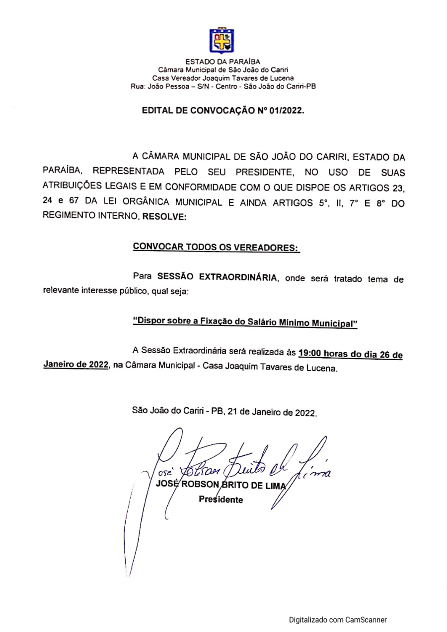 EDITAL DE CONVOCAÇÃO N° 0001/2022 - CONVOCAR TODOS OS VERIADORES