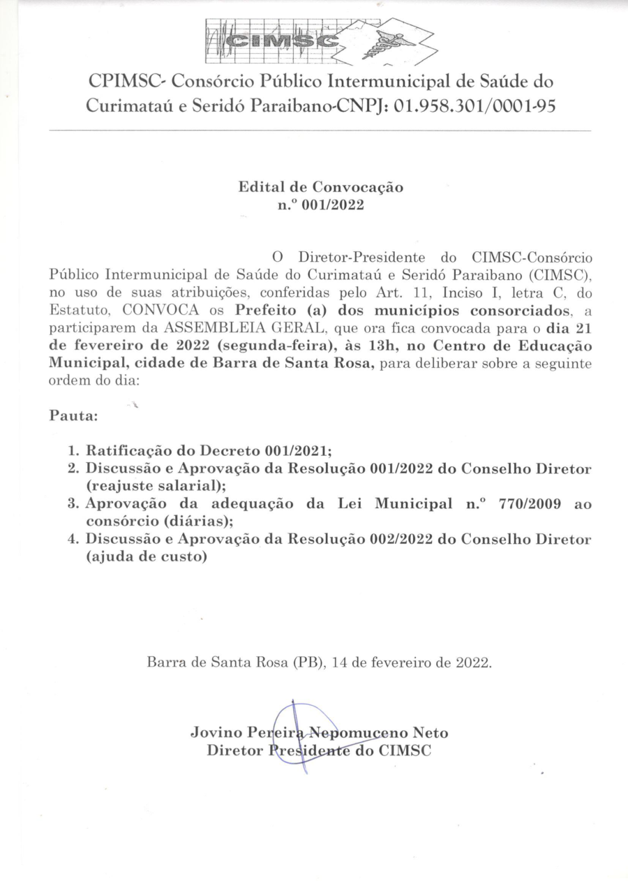 EDITAL DE CONVOCAÇÃO N° 0001/2022 - CONVOCA OS PREFEITOS (AS) DOS MUNICÍPIOS CONSORCIADOS PARA PARTICIPAREM DE UMA ASSEMBLÉIA GERAL