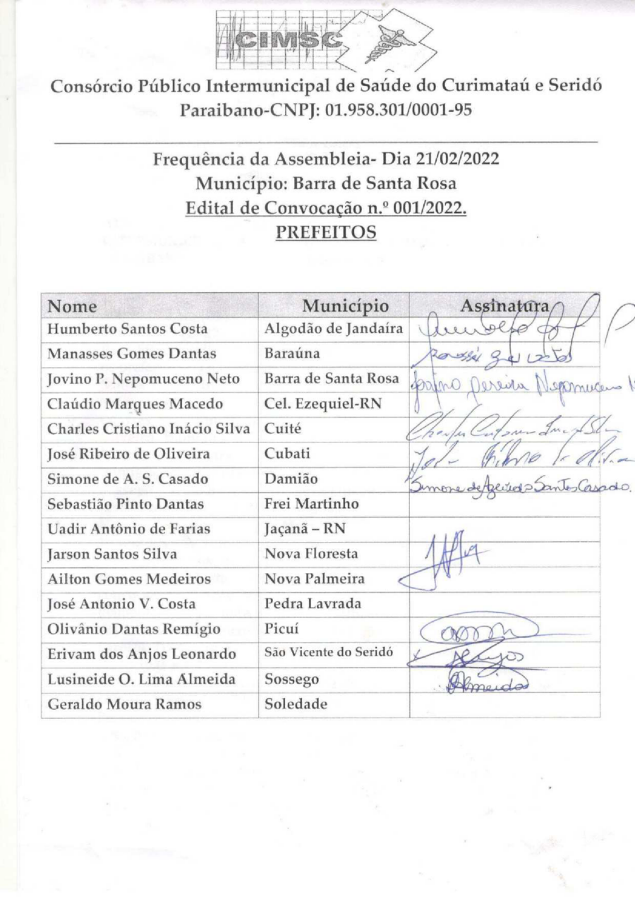 EDITAL DE CONVOCAÇÃO N° 0001/2022 - FREQUÊNCIA DA ASSEMBLÉIA 21 DE FEVEREIRO 2022