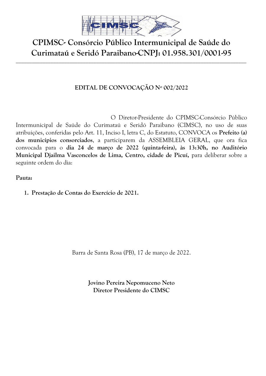 EDITAL DE CONVOCAÇÃO N° 0002/2022 - CONVOCA OS PREFEITOS(AS) DOS MUNICÍPIOS CONSORCIADOS A PARTICIPAREM DA ASSEMBLEIA GERAL