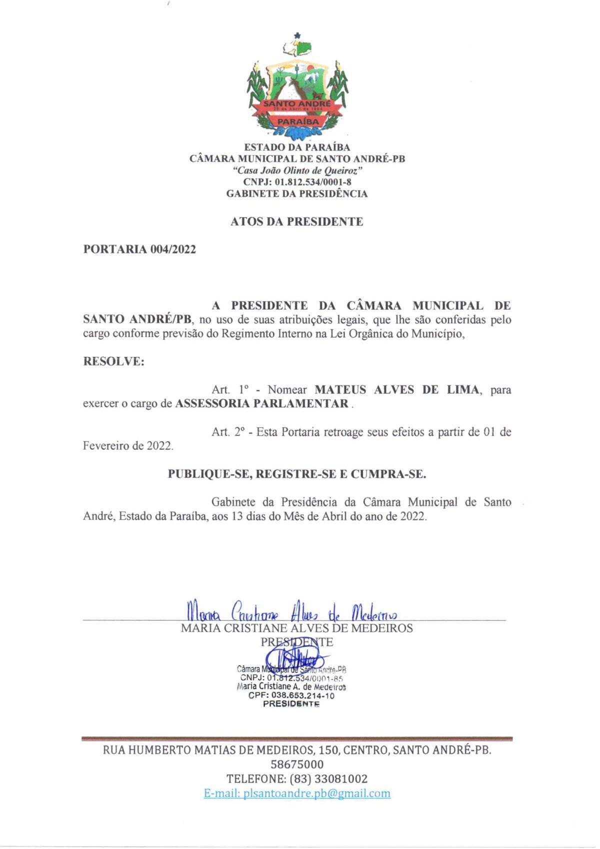 PORTARIA N° 0004/2022 - NOMEAÇÃO DE MATEUS ALVES DE LIMA PARA O CARGO DE ASSESSORIA PARLAMENTAR
