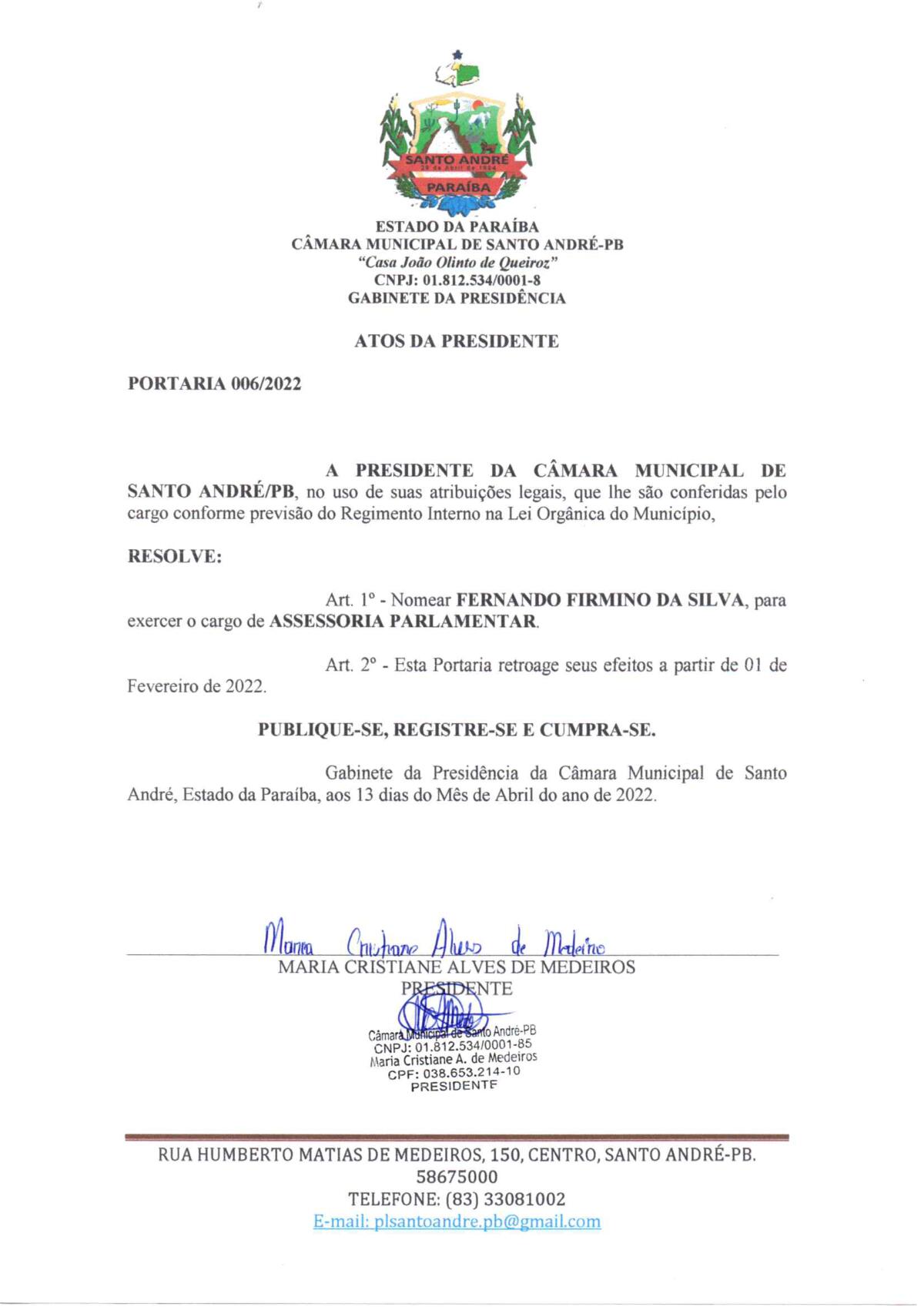 PORTARIA N° 0006/2022 - NOMEAÇÃO DE FERNANDO FIRMINO DA SILVA PARA O CARGO DE ASSESSORIA PARLAMENTAR