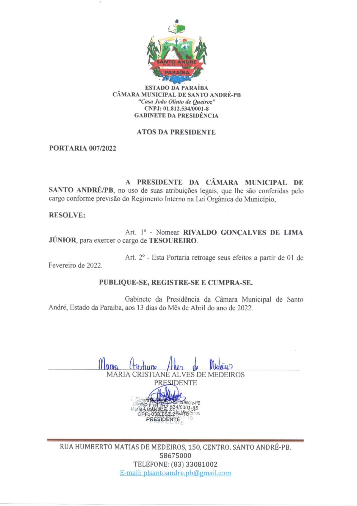 PORTARIA N° 0007/2022 - NOMEAÇÃO DE RIVALDO GONÇALVES DE LIMA JÚNIOR PARA O CARGO DE TESOUREIRO