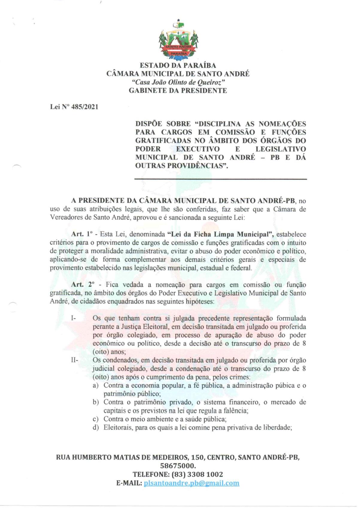 LEI N° 0485/2021 - DISPÕE SOBRE "DISCIPLINA AS NOMEAÇÕES PARA CARGOS EM COMISSÃO E FUNÇÕES GRATIFICADAS NO ÂMBITO DOS ÓRGÃOS DO PODER EXECUTIVO E LEGISLATIVO"
