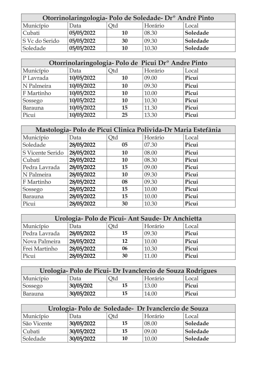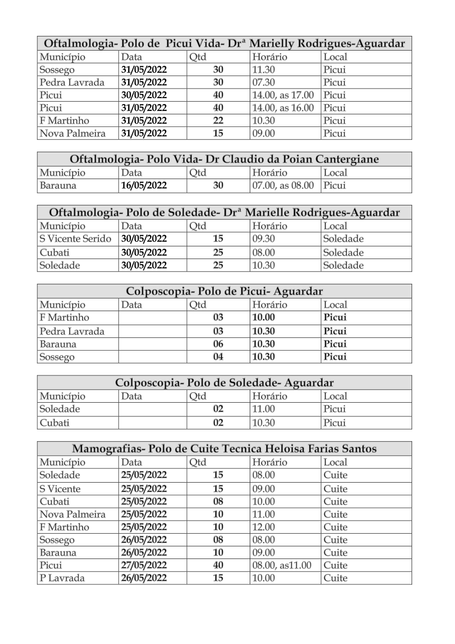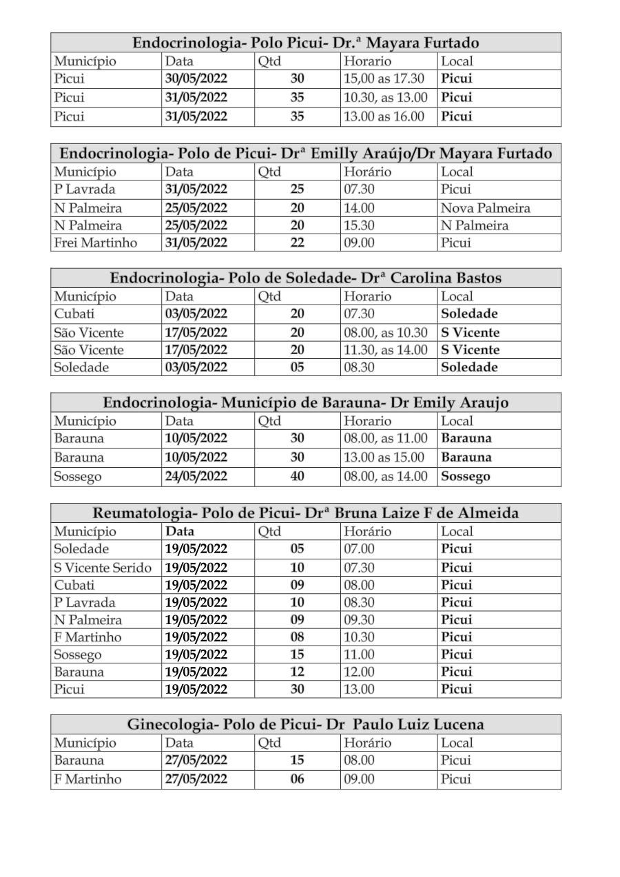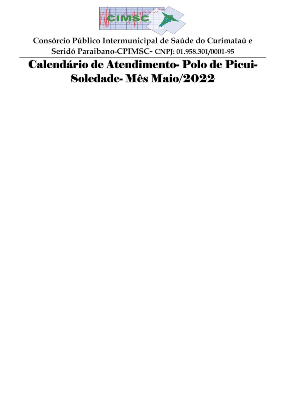 CALENDÁRIO DE ATENDIMENTO - POLO DE PICUI - SOLEDADE - MÊS MAIO/2022