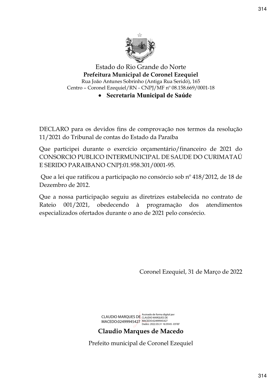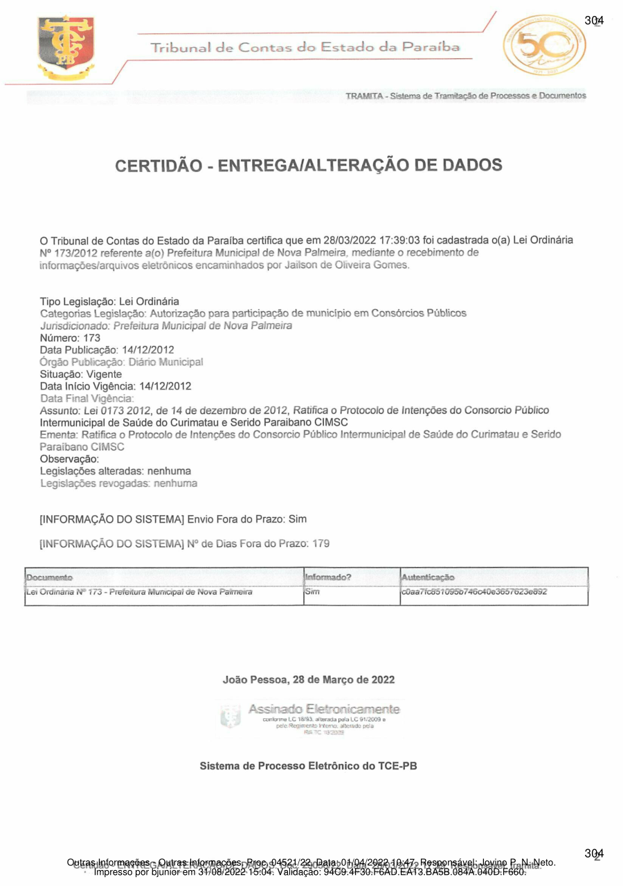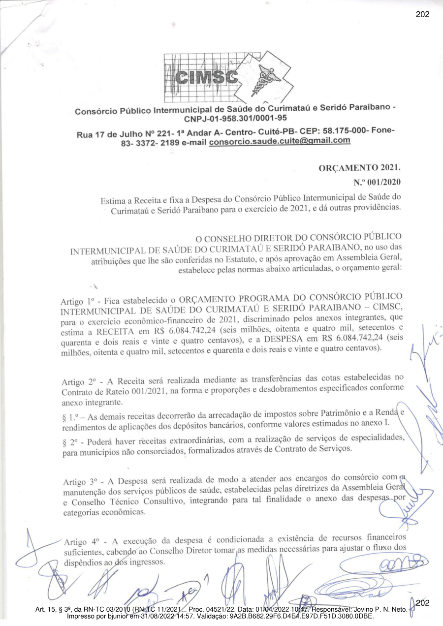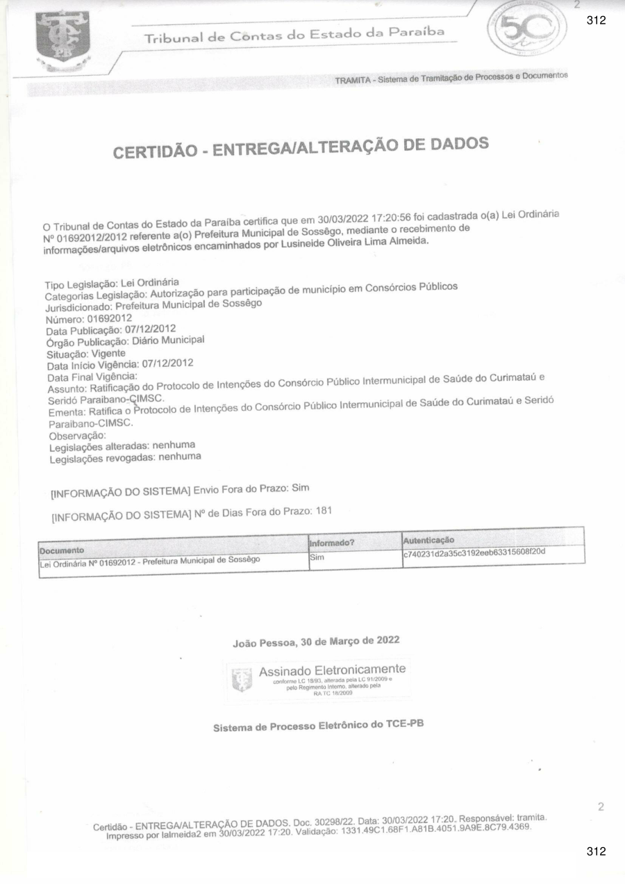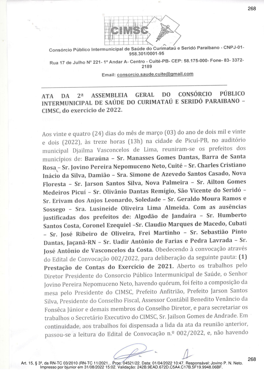 Conforme MP n° 2.200-2 de 24/08/2001, que institui a infraestrutura de chaves Públicas. Matéria Publicada no Diário Oficial do Consórcio Intermunicipal de Saúde do Curimataú e Seridó Paraibano/PB no dia - Edição 00457.