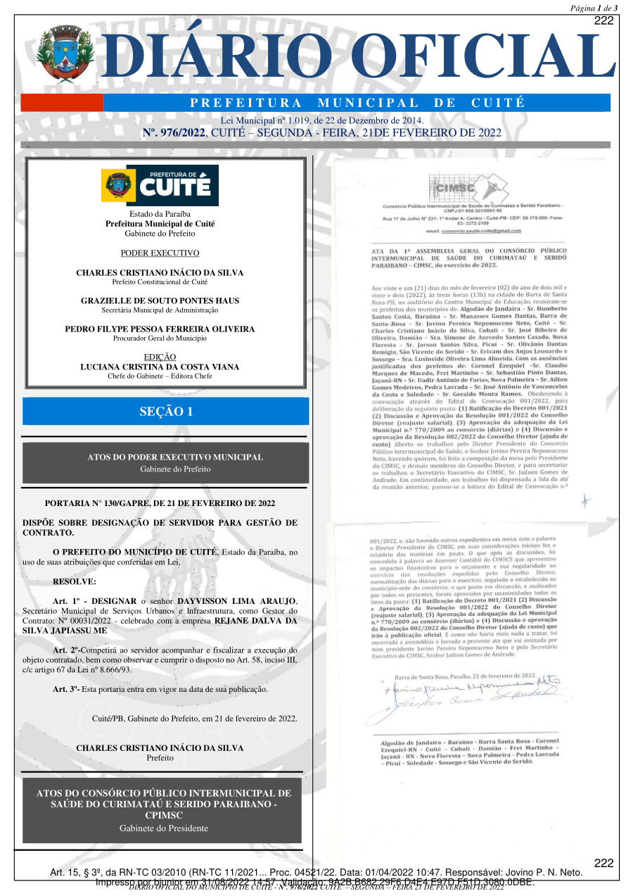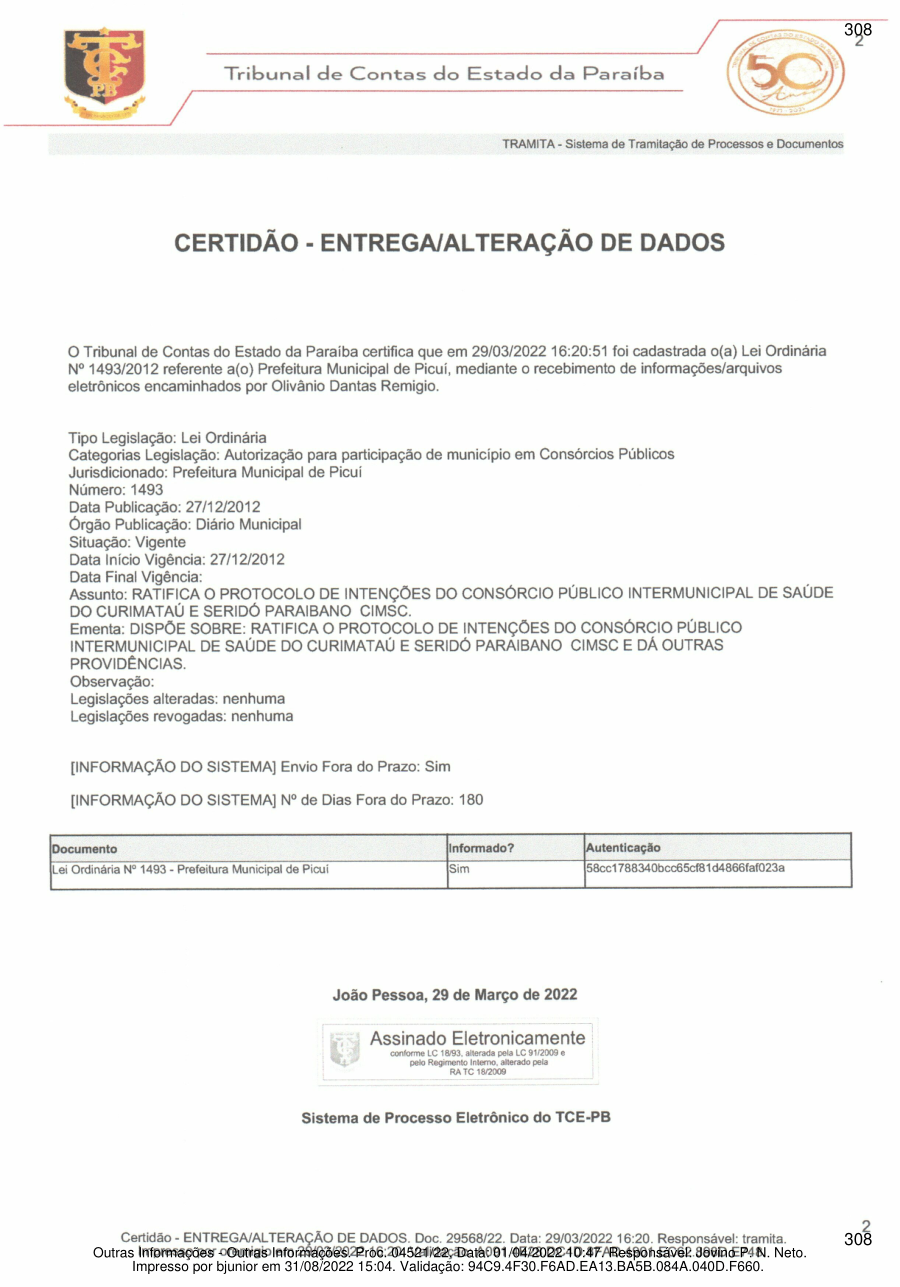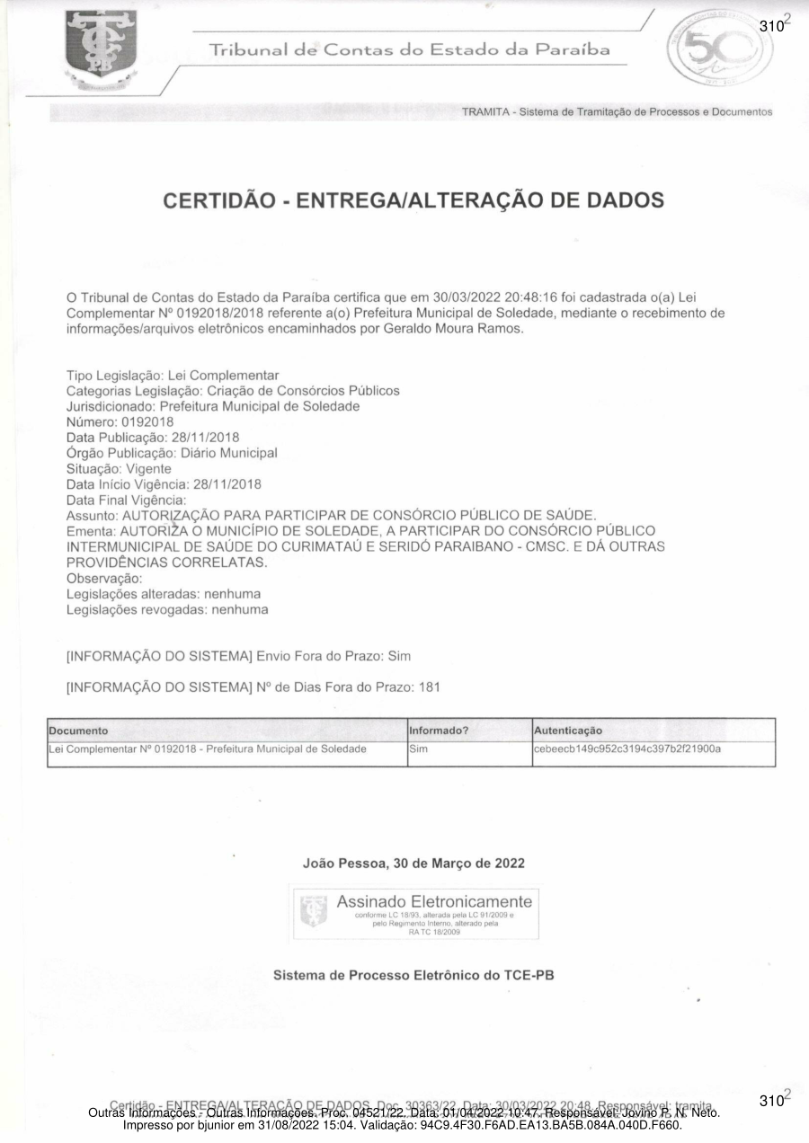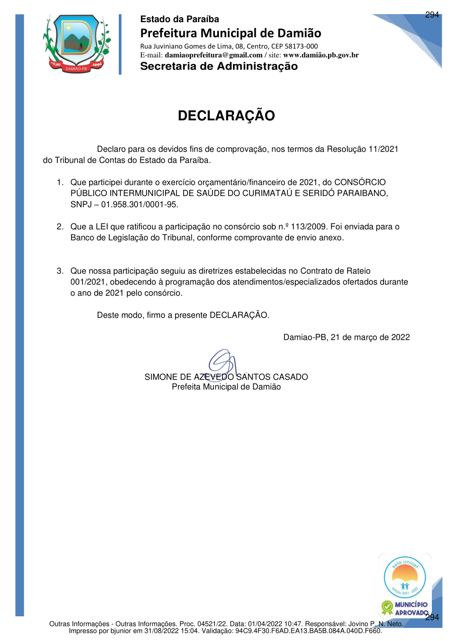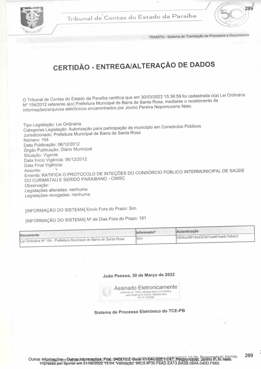 Conforme MP n° 2.200-2 de 24/08/2001, que institui a infraestrutura de chaves Públicas. Matéria Publicada no Diário Oficial do Consórcio Intermunicipal de Saúde do Curimataú e Seridó Paraibano/PB no dia - Edição 00457.