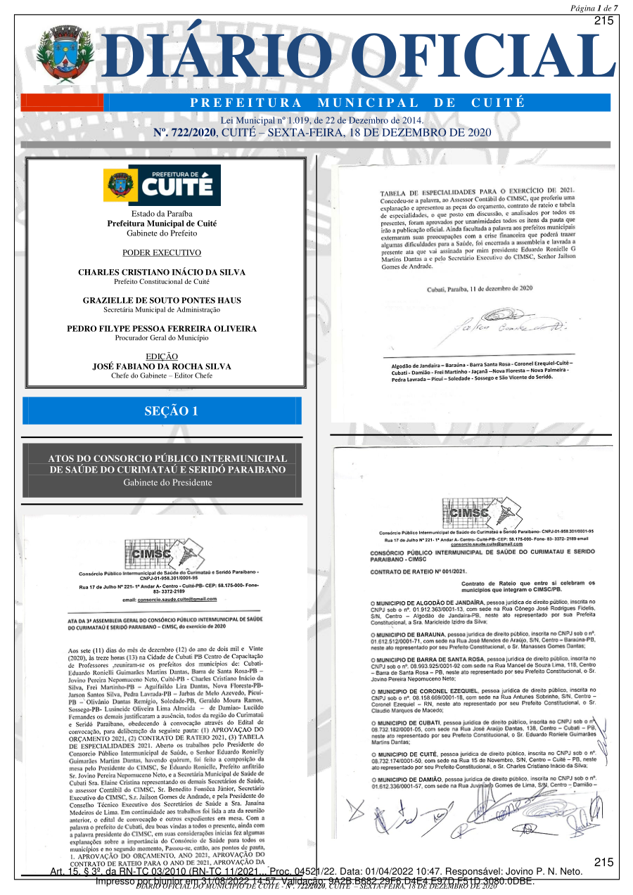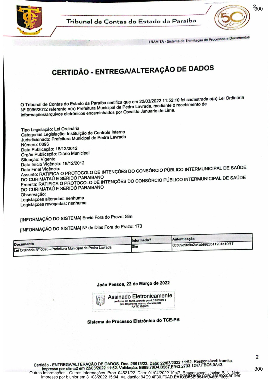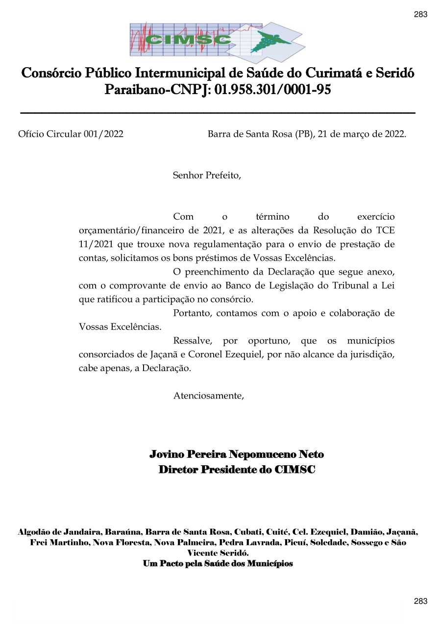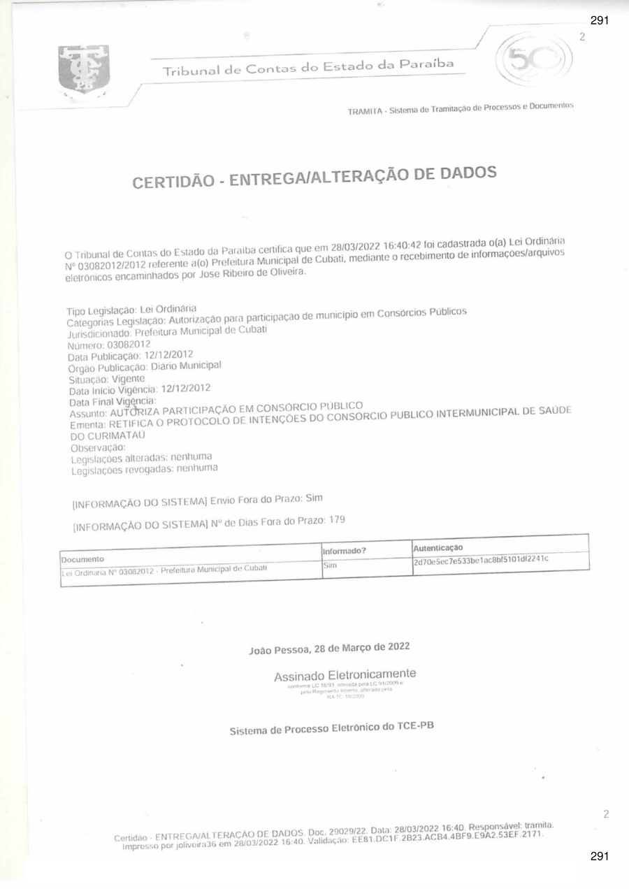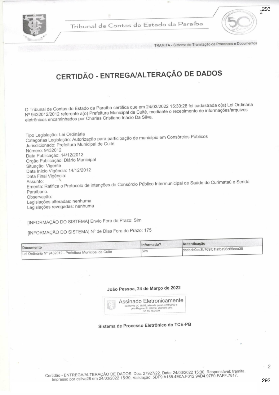 Conforme MP n° 2.200-2 de 24/08/2001, que institui a infraestrutura de chaves Públicas. Matéria Publicada no Diário Oficial do Consórcio Intermunicipal de Saúde do Curimataú e Seridó Paraibano/PB no dia - Edição 00457.
