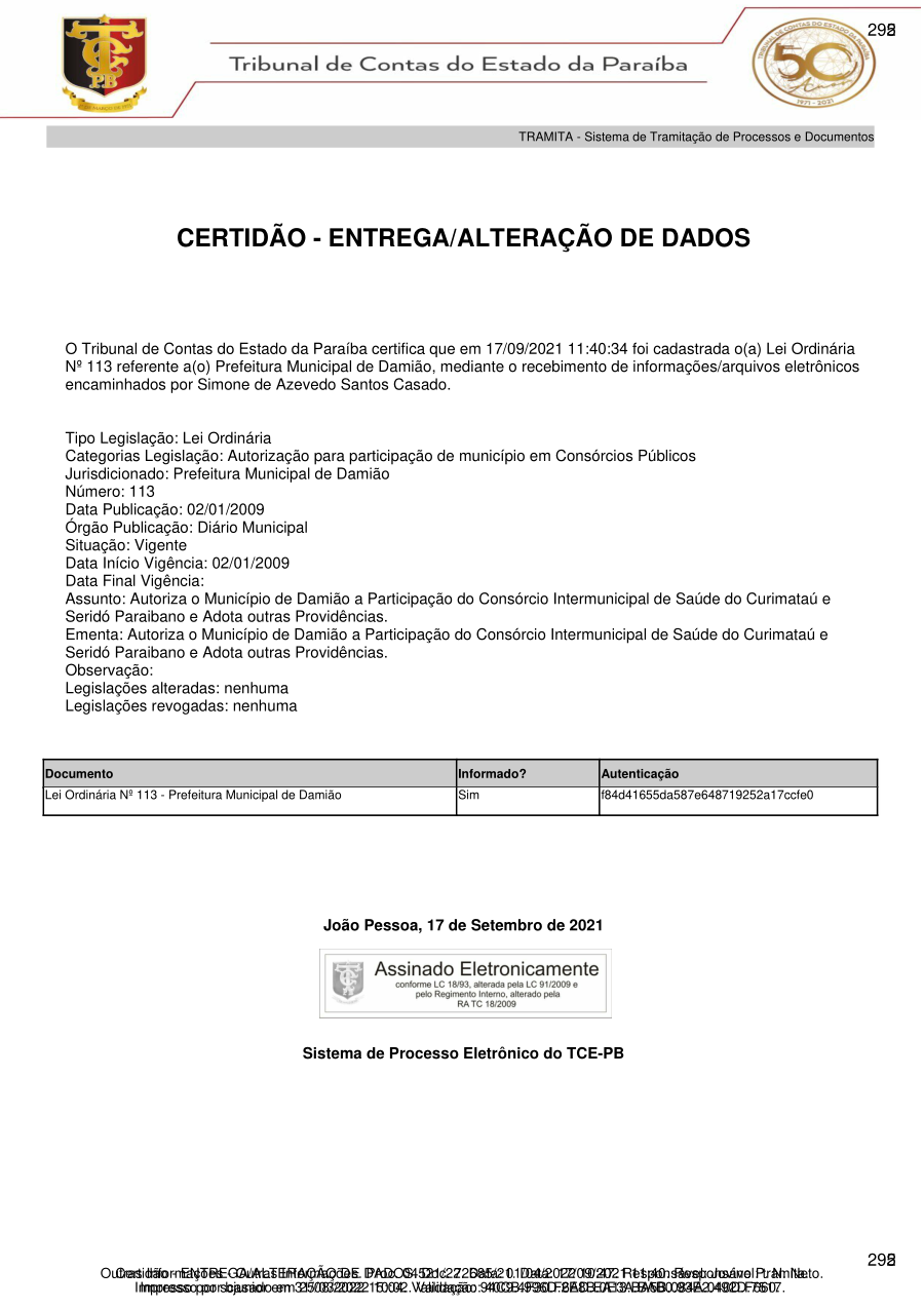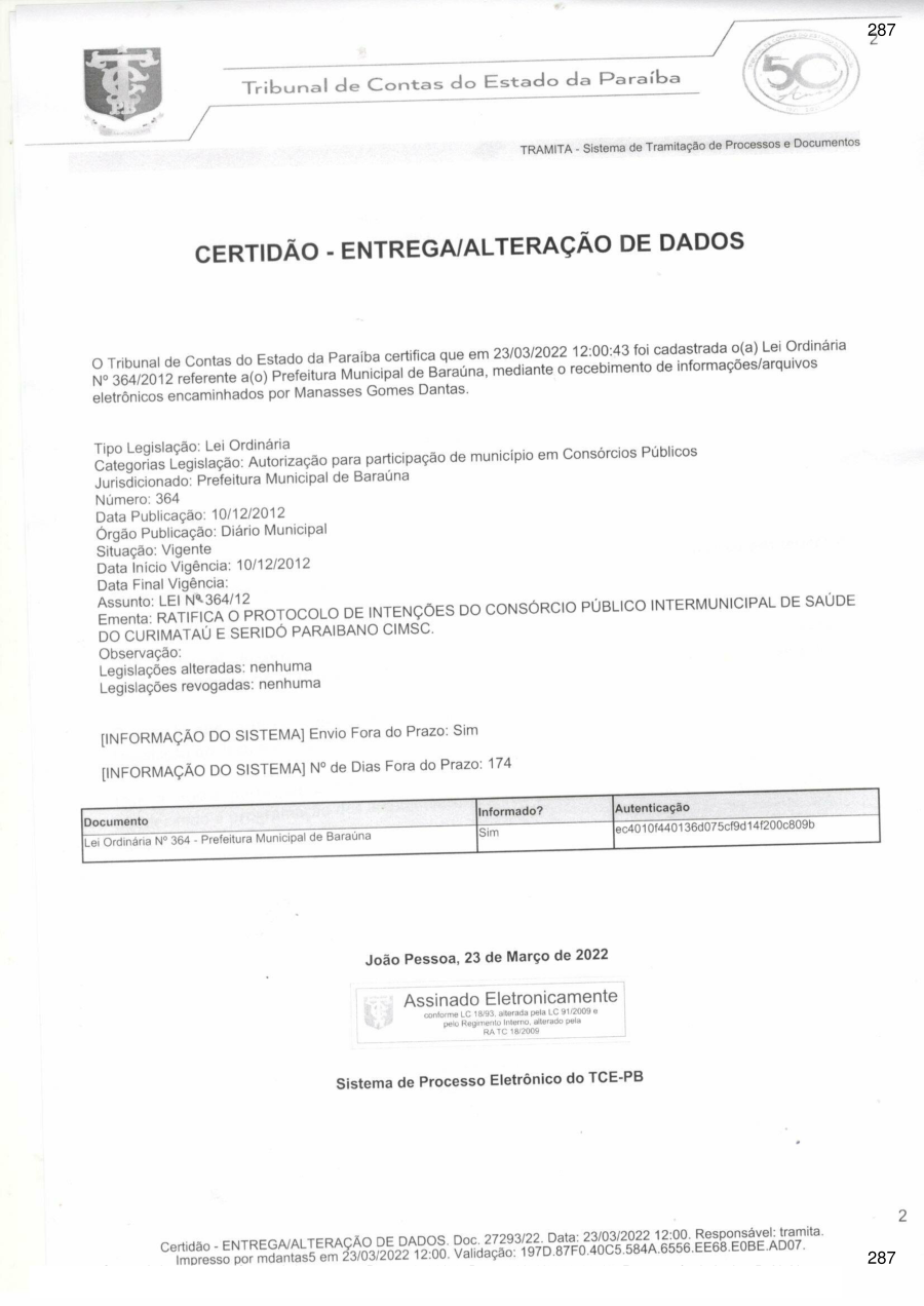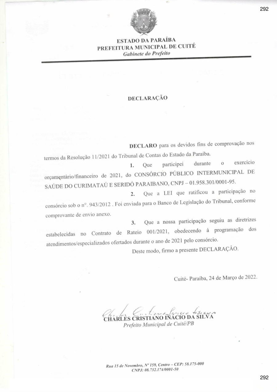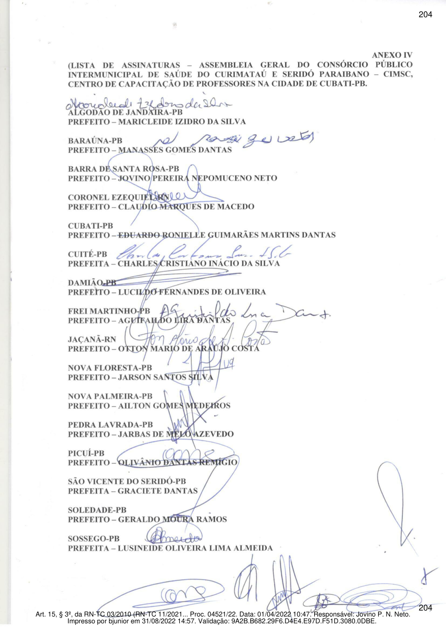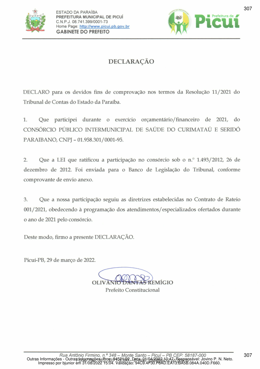 Conforme MP n° 2.200-2 de 24/08/2001, que institui a infraestrutura de chaves Públicas. Matéria Publicada no Diário Oficial do Consórcio Intermunicipal de Saúde do Curimataú e Seridó Paraibano/PB no dia - Edição 00457.