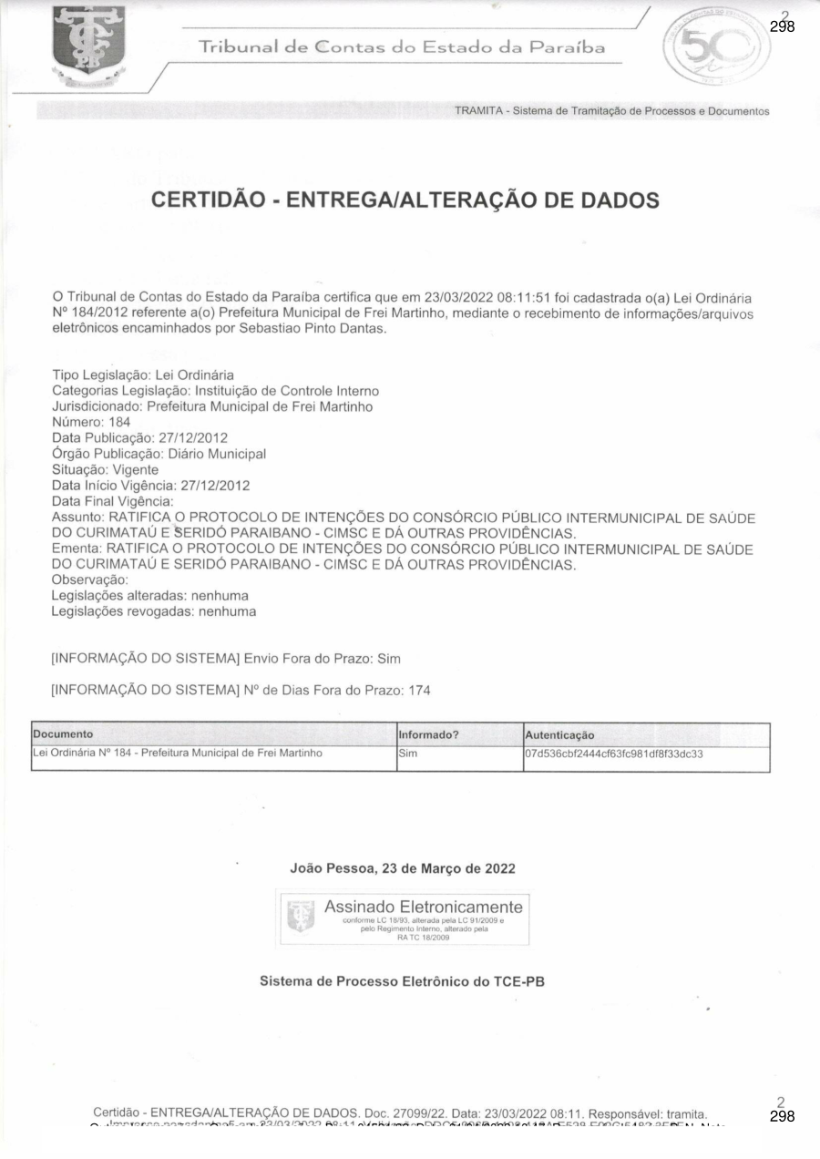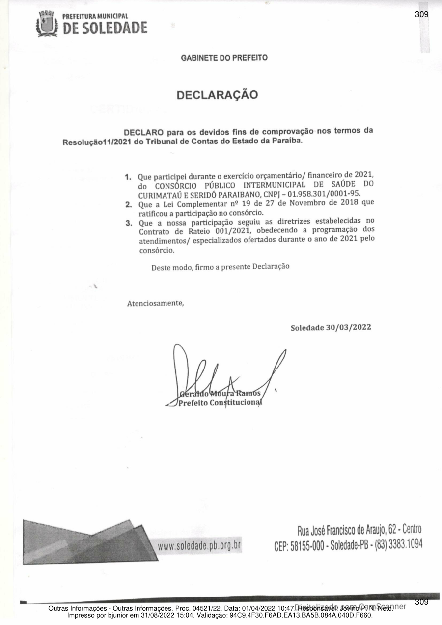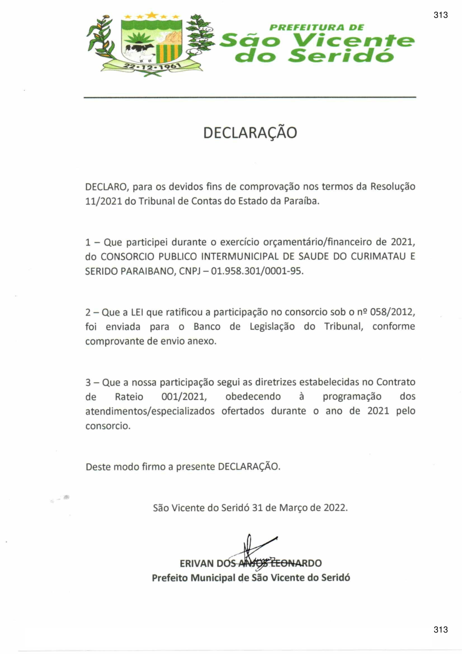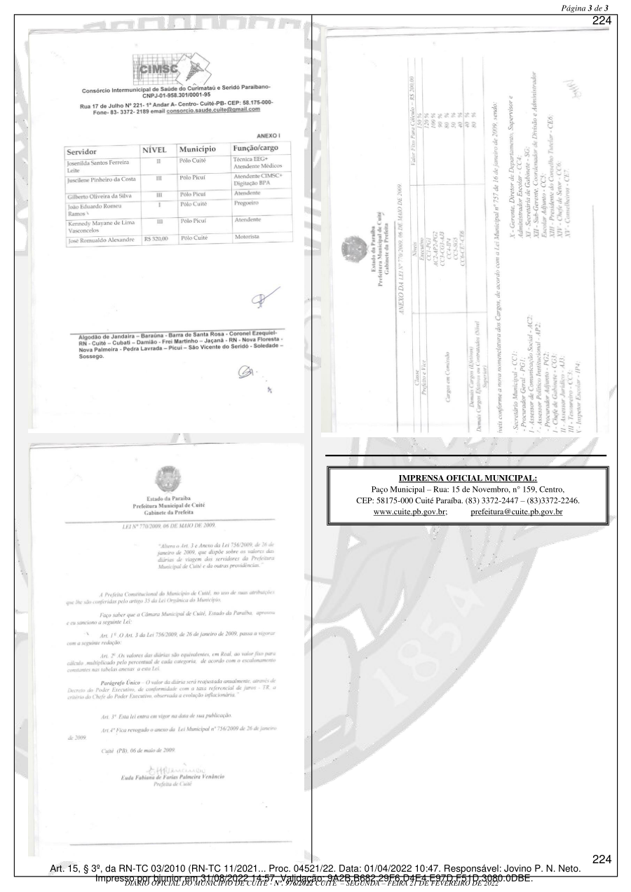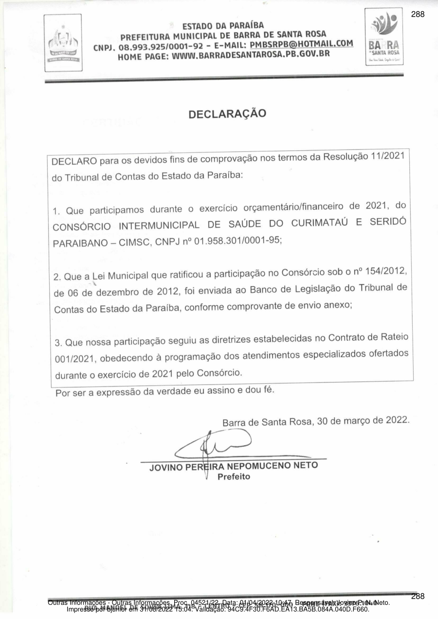 Conforme MP n° 2.200-2 de 24/08/2001, que institui a infraestrutura de chaves Públicas. Matéria Publicada no Diário Oficial do Consórcio Intermunicipal de Saúde do Curimataú e Seridó Paraibano/PB no dia - Edição 00457.