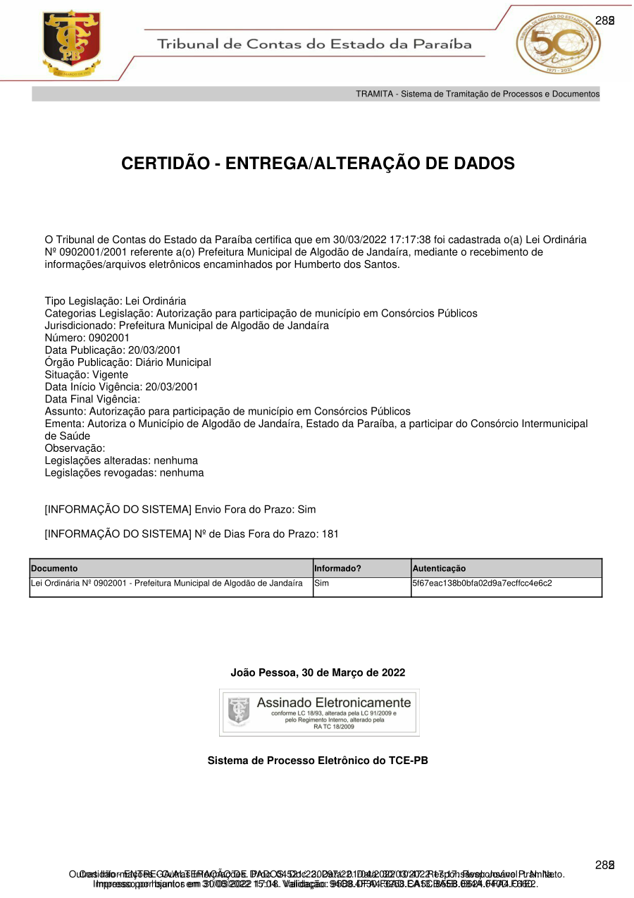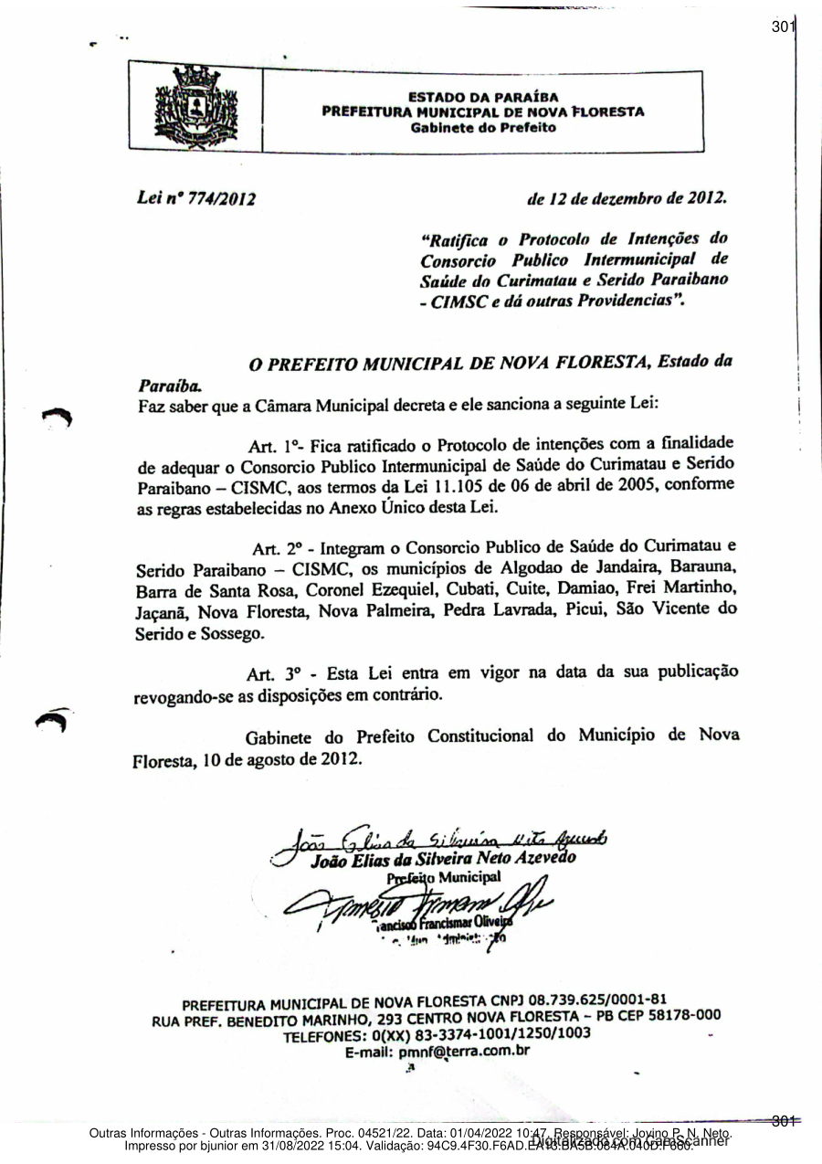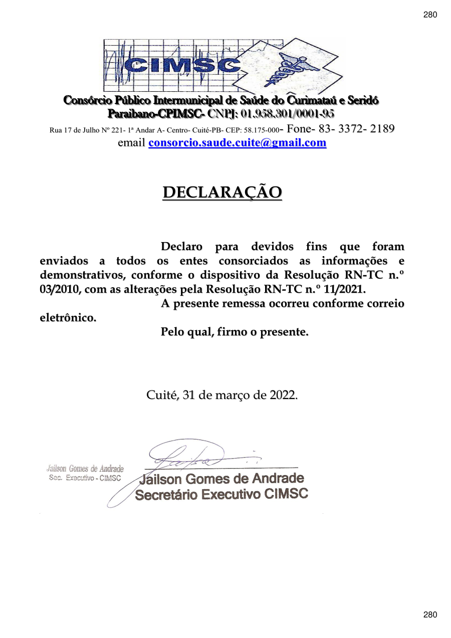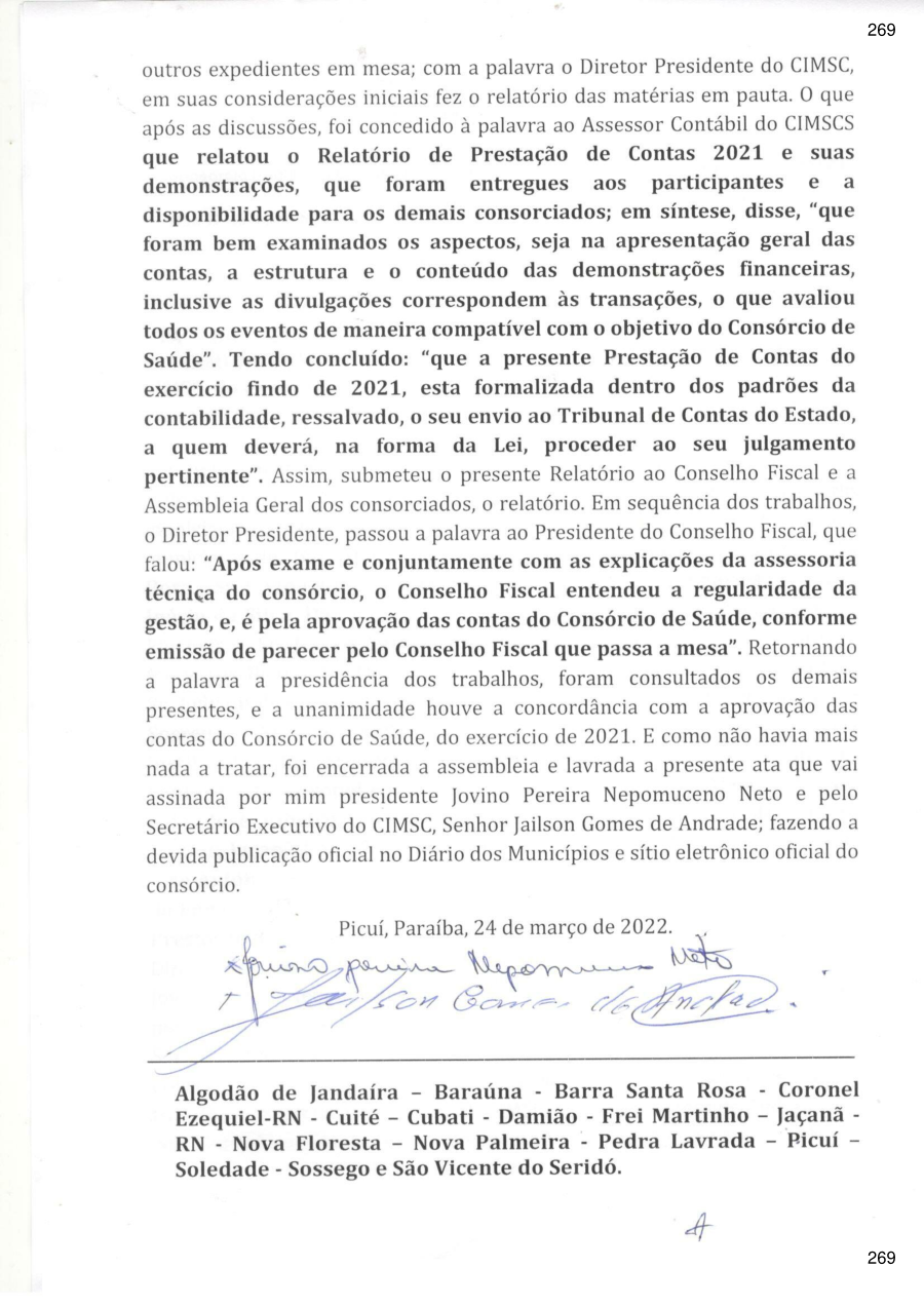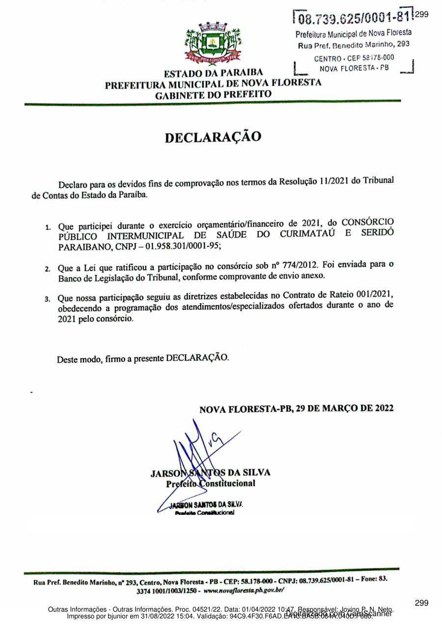 Conforme MP n° 2.200-2 de 24/08/2001, que institui a infraestrutura de chaves Públicas. Matéria Publicada no Diário Oficial do Consórcio Intermunicipal de Saúde do Curimataú e Seridó Paraibano/PB no dia - Edição 00457.
