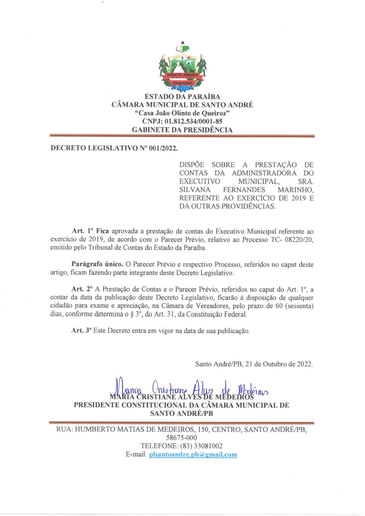 DECRETO LEGISLATIVO N° 0001/2022 - DISPOE SOBRE A PRESTAQAO DE CONTAS DA ADMINISTRADORA DO EXECUTIVO MUNICIPAL SRA. SILVANA FERNANDES MARINHO REFERENTE AO EXERCICIO DE 2019