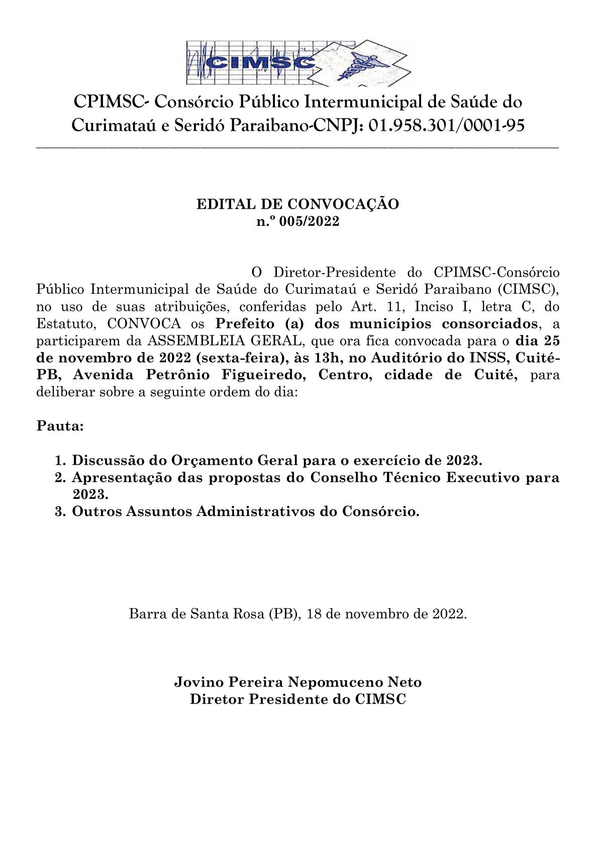 EDITAL DE CONVOCAÇÃO Nº 0005/2022