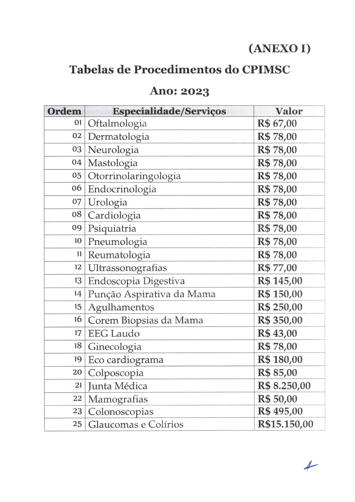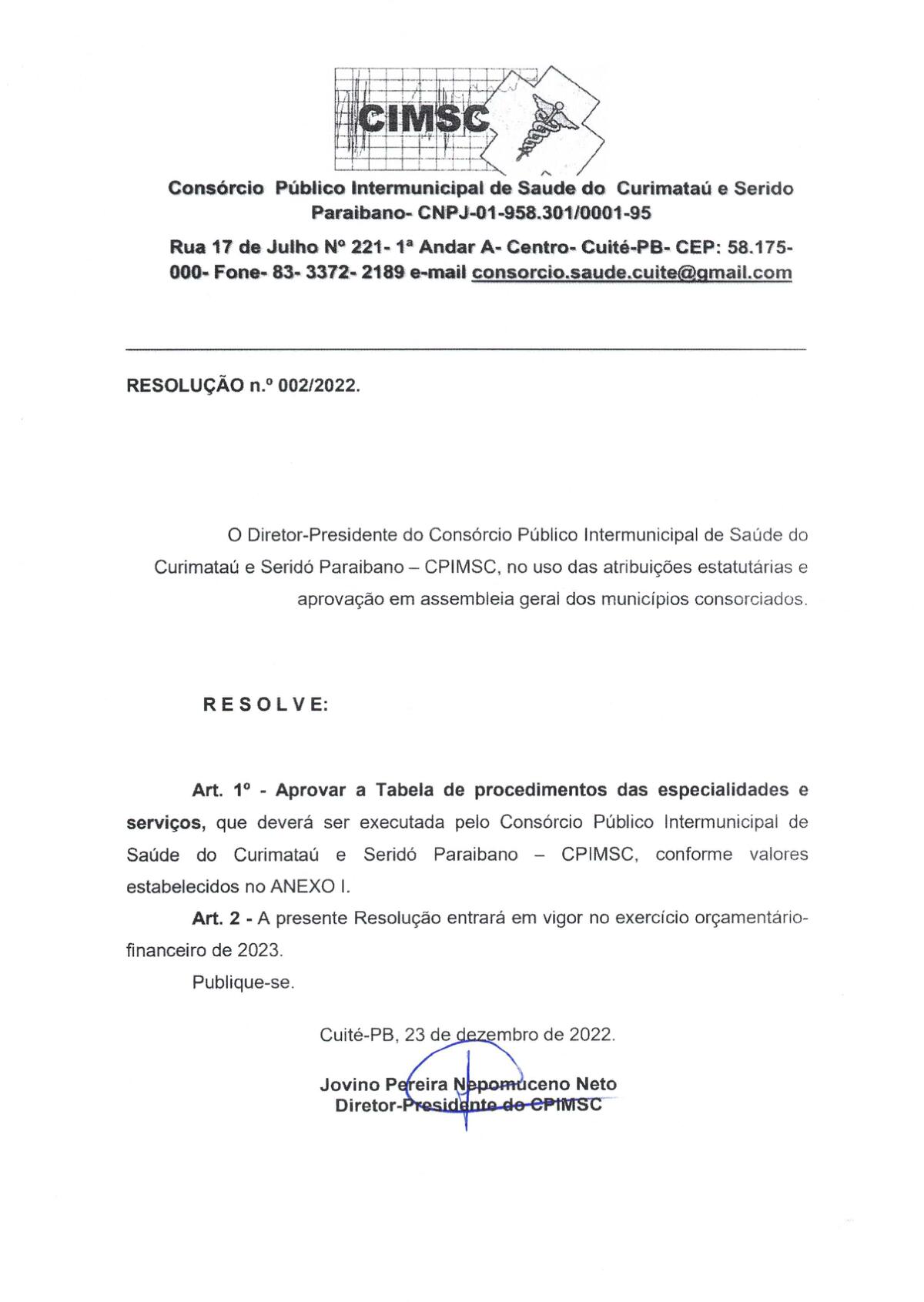 RESOLUÇAO N° 0002/2022 - APROVAR A TABELA DE PROCEDIMENTOS DAS ESPECIALIDADES E SERVIGOS