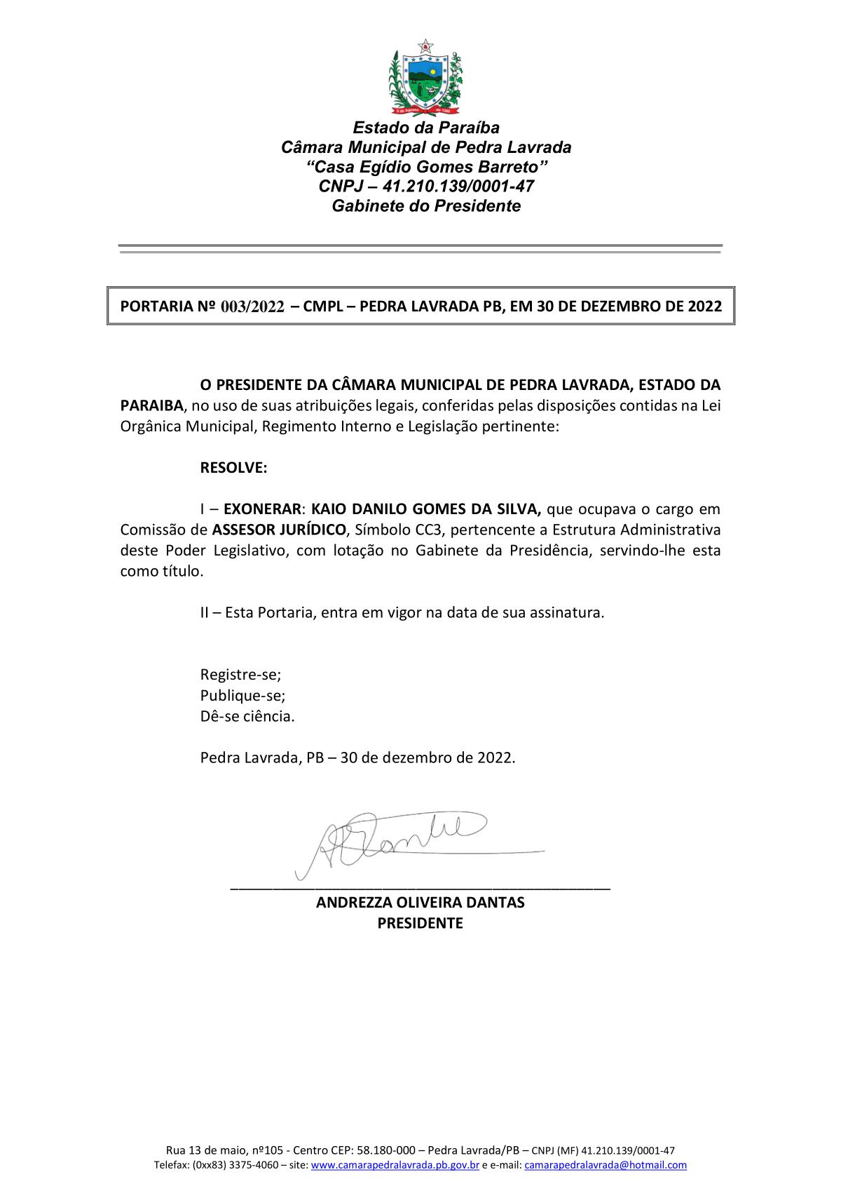 PORTARIA N° 0003/2022 - EXONERAÇÃO DE KAIO DANILO GOMES DA SILVA QUE OCUPAVA O CARGO EM COMISSÃO DE ASSESOR JURÍDICO