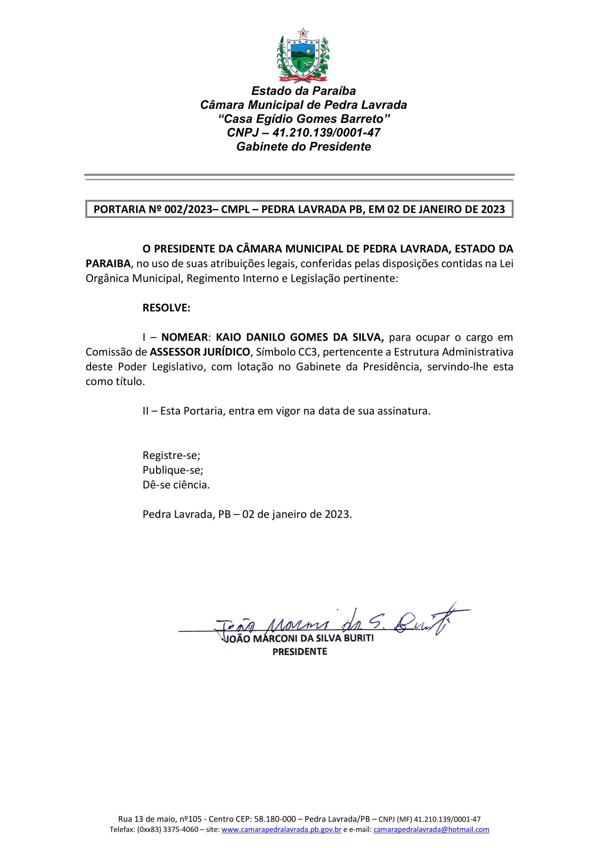 PORTARIA N° 0002/2023 - NOMEAÇÃO DE KAIO DANILO GOMES DA SILVA PARA OCUPAR O CARGO EM COMISSÃO DE ASSESSOR JURÍDICO