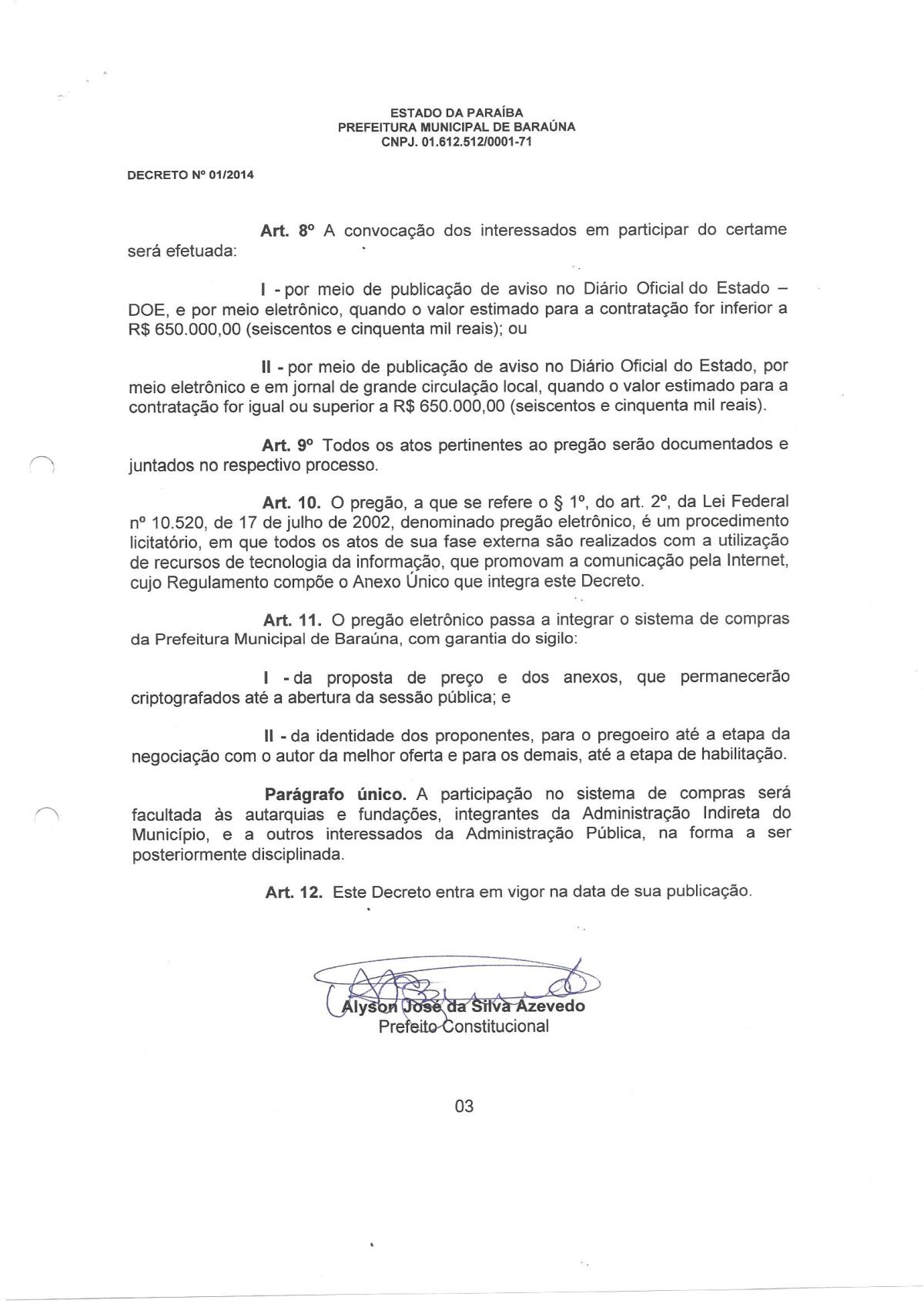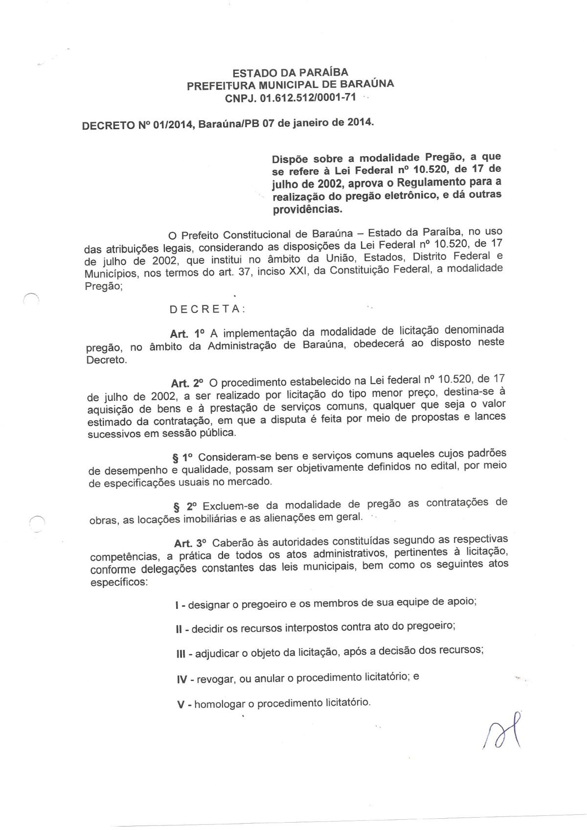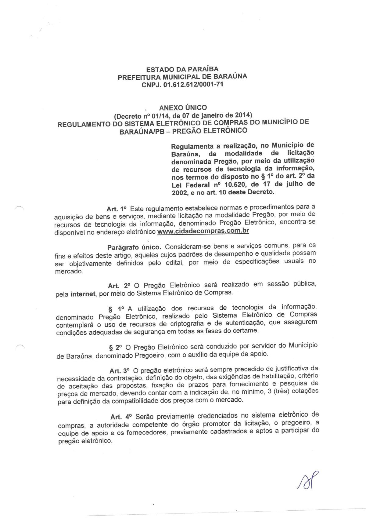 DECRETO Nº 001/2014 - MODAILIDADE PREGÃO ELETRÔNICO