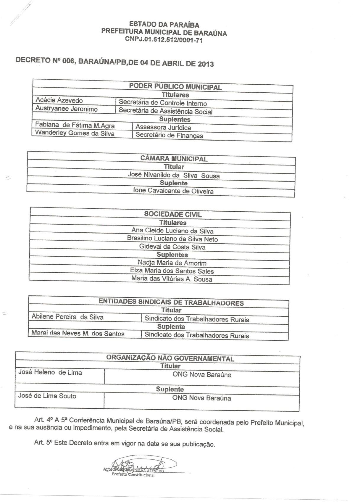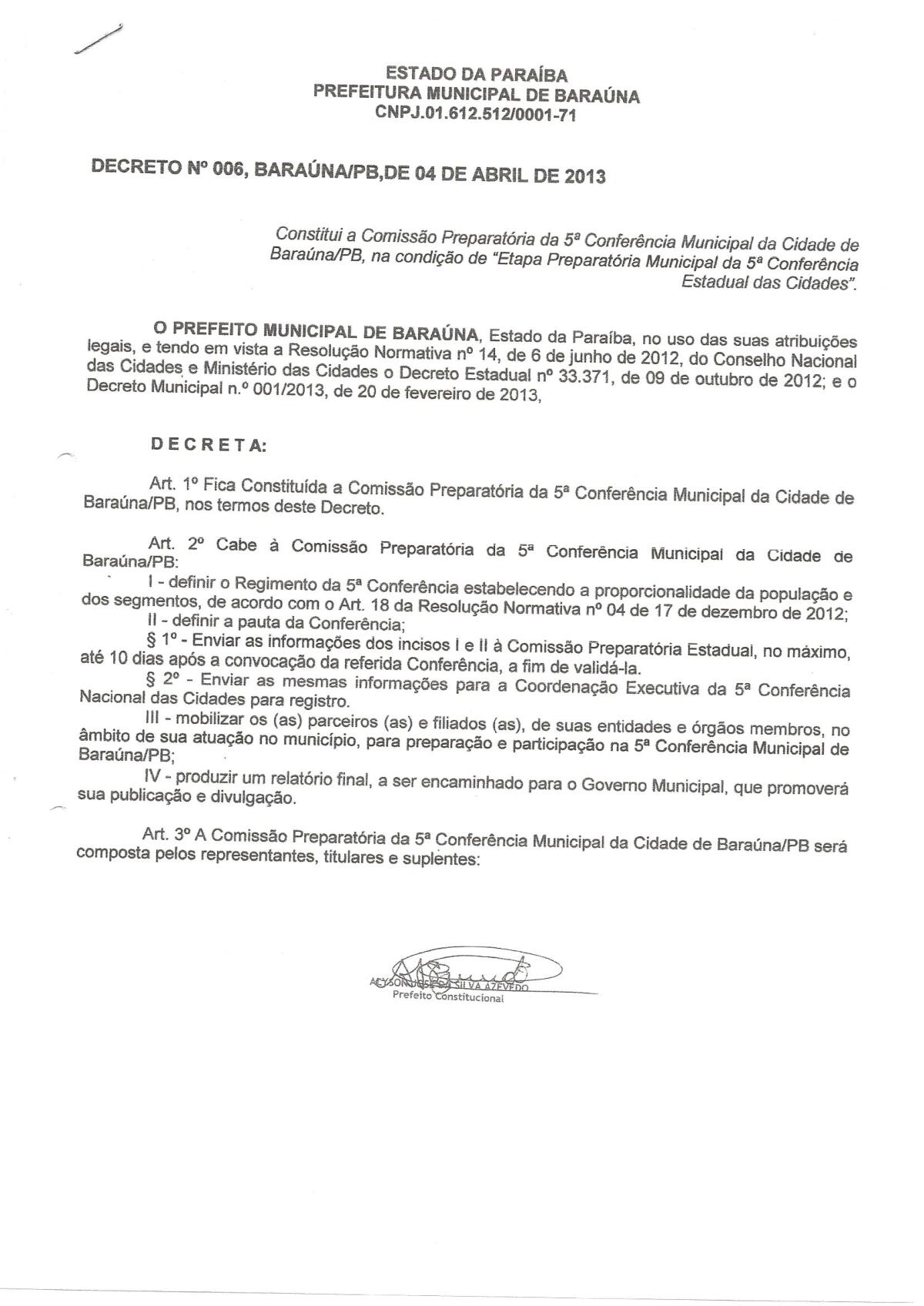 DECRETO Nº 006/2013 - COMISSÃO PREPARATÓRIA DA 5ª CONFERÊNCIA MUNICIPAL DE CIDADE DE BARAÚNA/PB