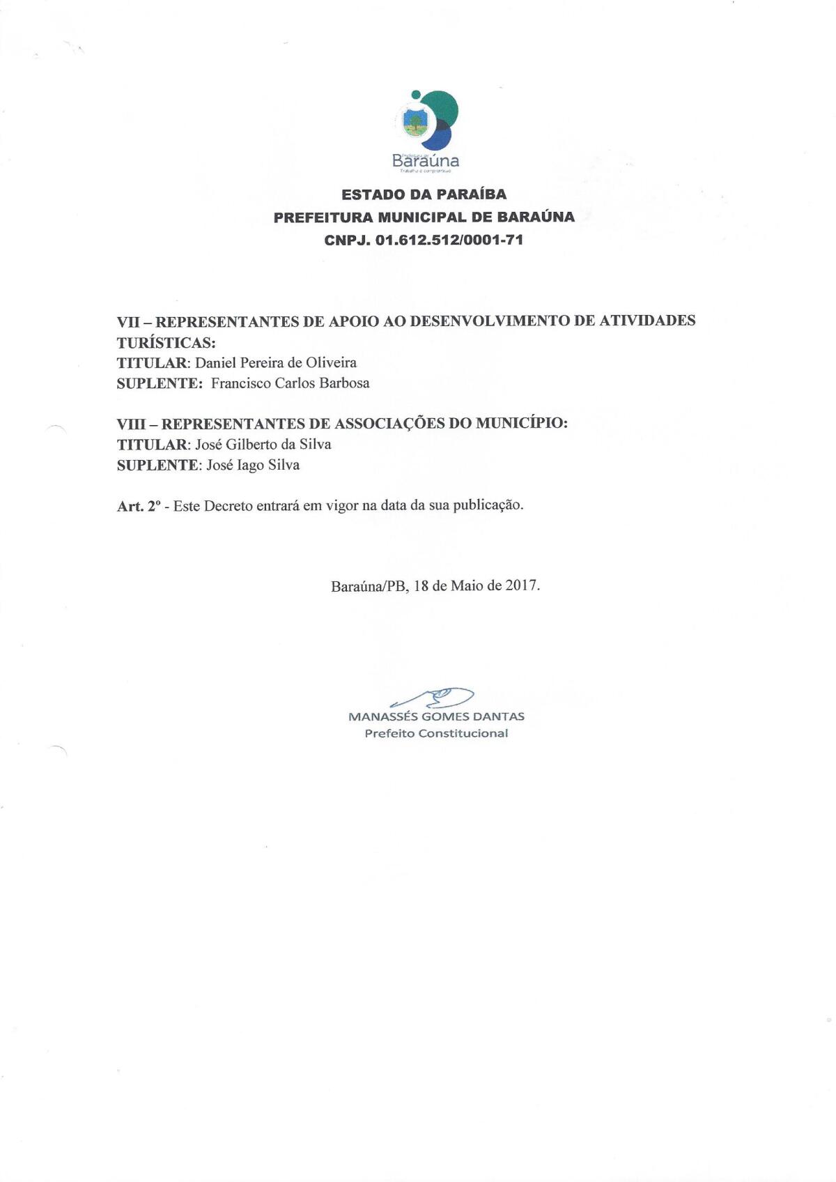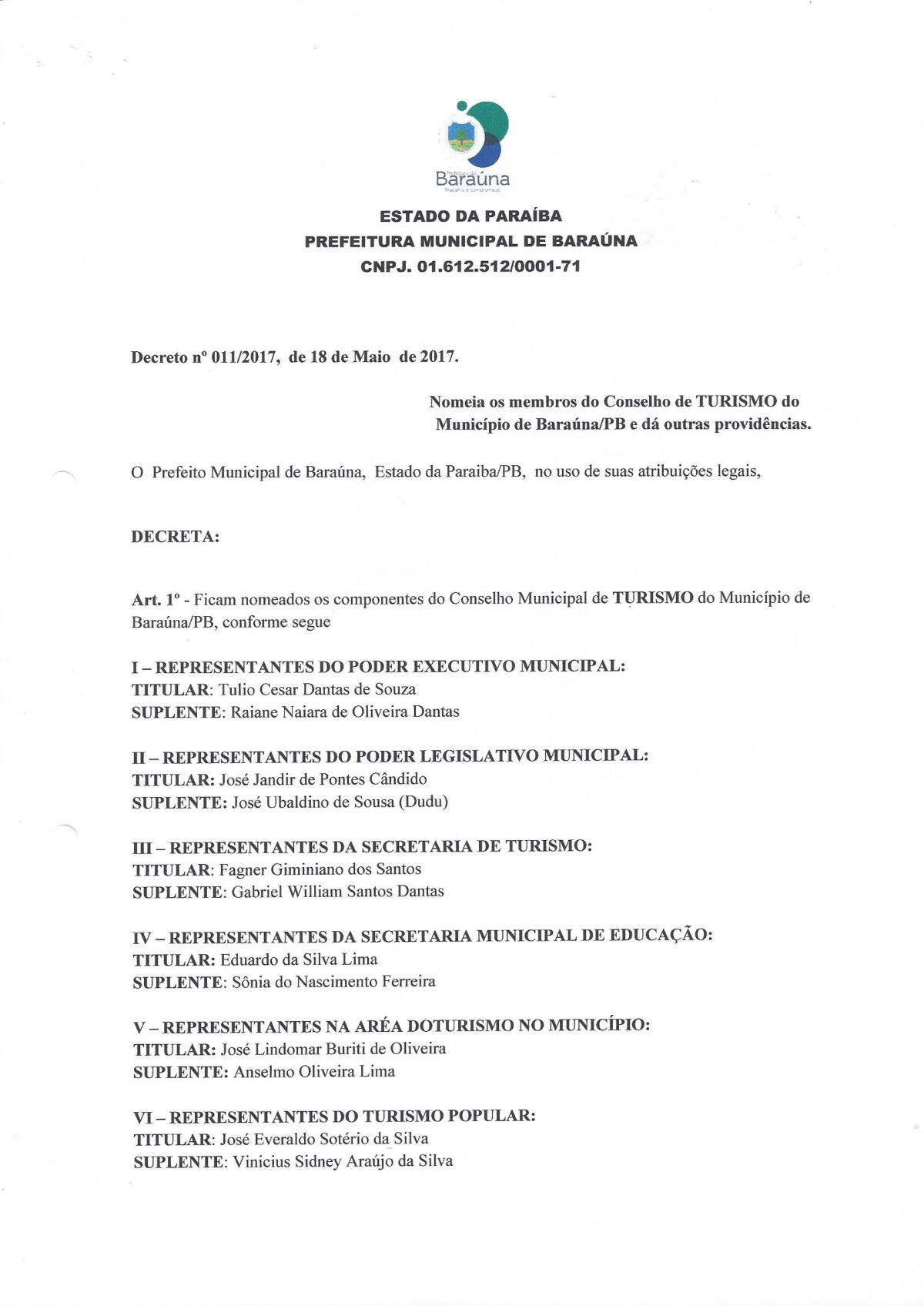 DECRETO Nº 011/2017 - NOMEIA OS MEMBROS DO CONSELHO DE TURISMO DO MUNICÍPIO DE BARAÚNA/PB E DÁ OUTRAS PROVIDÊNCIAS.