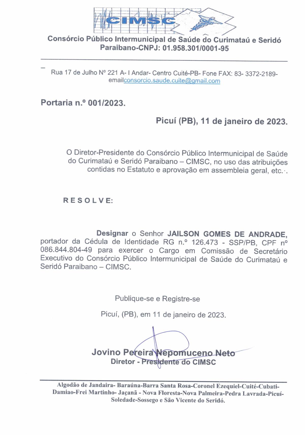 PORTARIA N° 0001/2023 - DESIGNAR O SENHOR JAILSON GOMES DE ANDRADE PARA EXERCER O CARGO EM COMISSAO DE SECRETÁRIO EXECUTIVO DO CONSÓRCIO