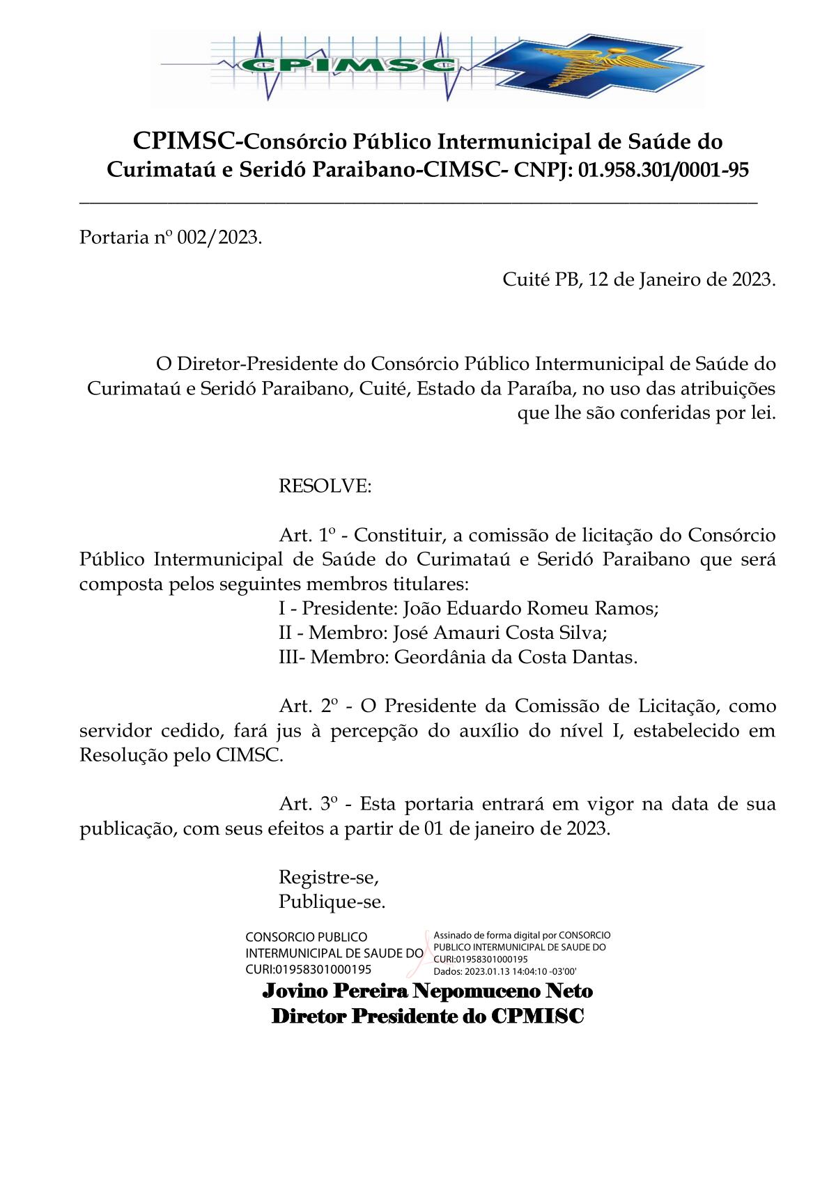 PORTARIA N° 0002/2023 - CONSTITUIR A COMISSÃO DE LICITAÇÃO DO CONSÓRCIO PÚBLICO INTERMUNICIPAL DE SAÚDE DO CURIMATAÚ E SERIDÓ PARAIBANO