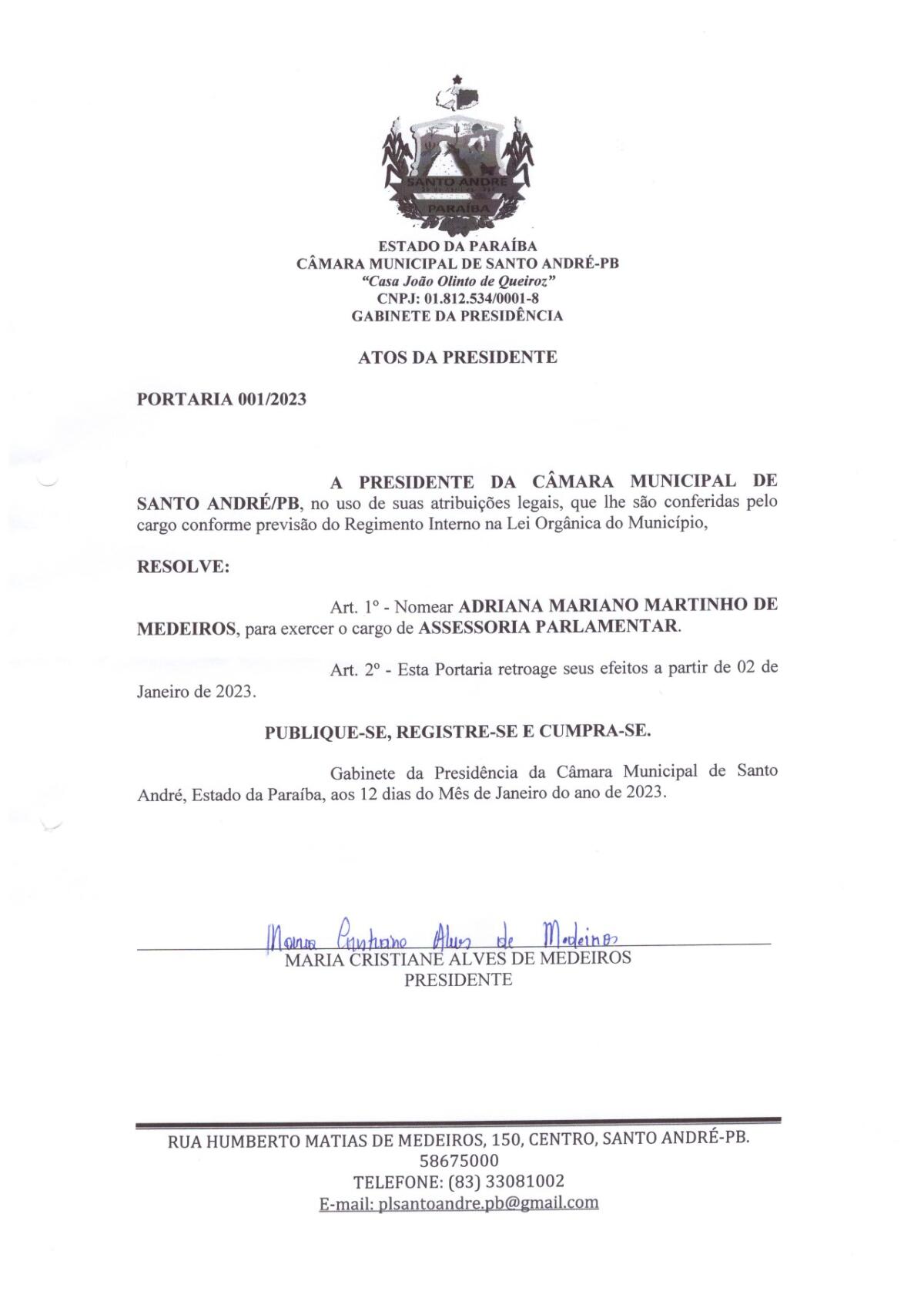 PORTARIA N° 0001/2023 - NOMEAÇÃO DE ADRIANA MARIANO MARTINHO DE MEDEIROS PARA EXERCER O CARGO DE ASSESSORIA PARLAMENTAR.