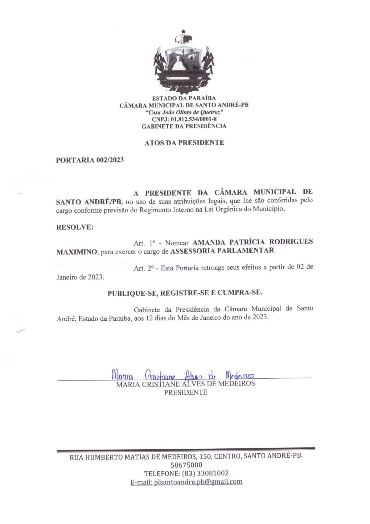 PORTARIA N° 0002/2023 - NOMEAÇÃO DE AMANDA PATRICIA RODRIGUES MAXIMINO PARA EXERCER O CARGO DE ASSESSORIA PARLAMENTAR