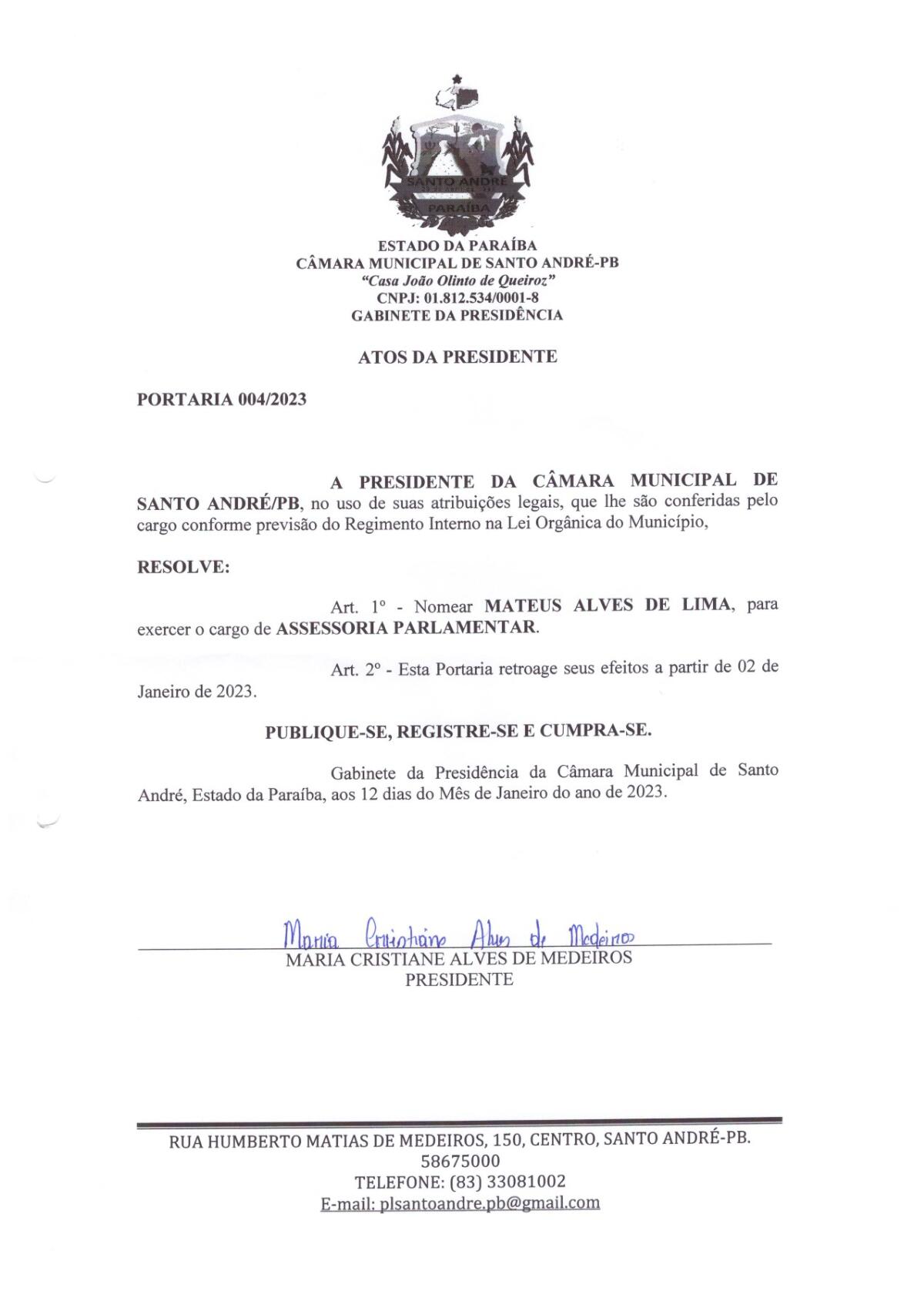 PORTARIA N° 0004/2023 - NOMEAÇÃO DE MATEUS ALVES DE LIMA PARA EXERCER O CARGO DE ASSESSORIA PARLAMENTAR