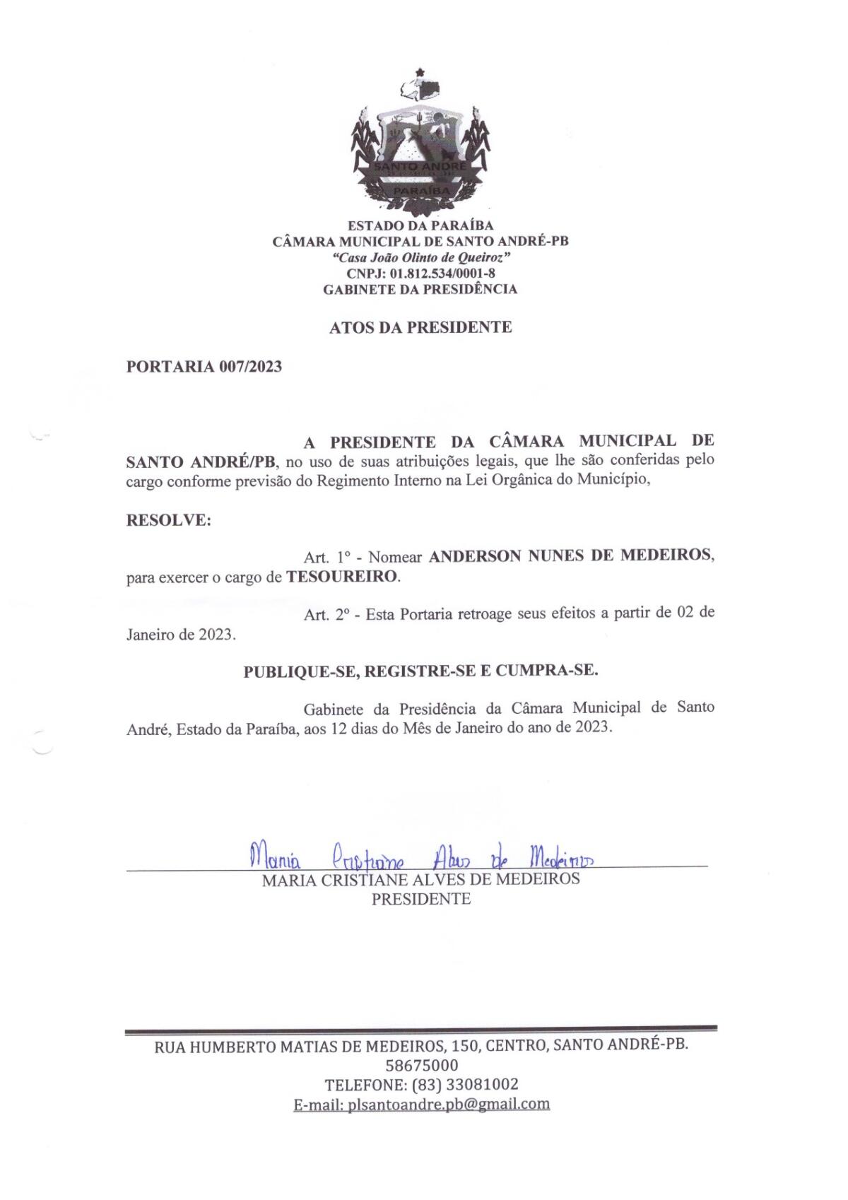 PORTARIA N° 0007/2023 - NOMEAÇÃO DE ANDERSON NUNES DE MEDEIROS PARA EXERCER O CARGO DE TESOUREIRO