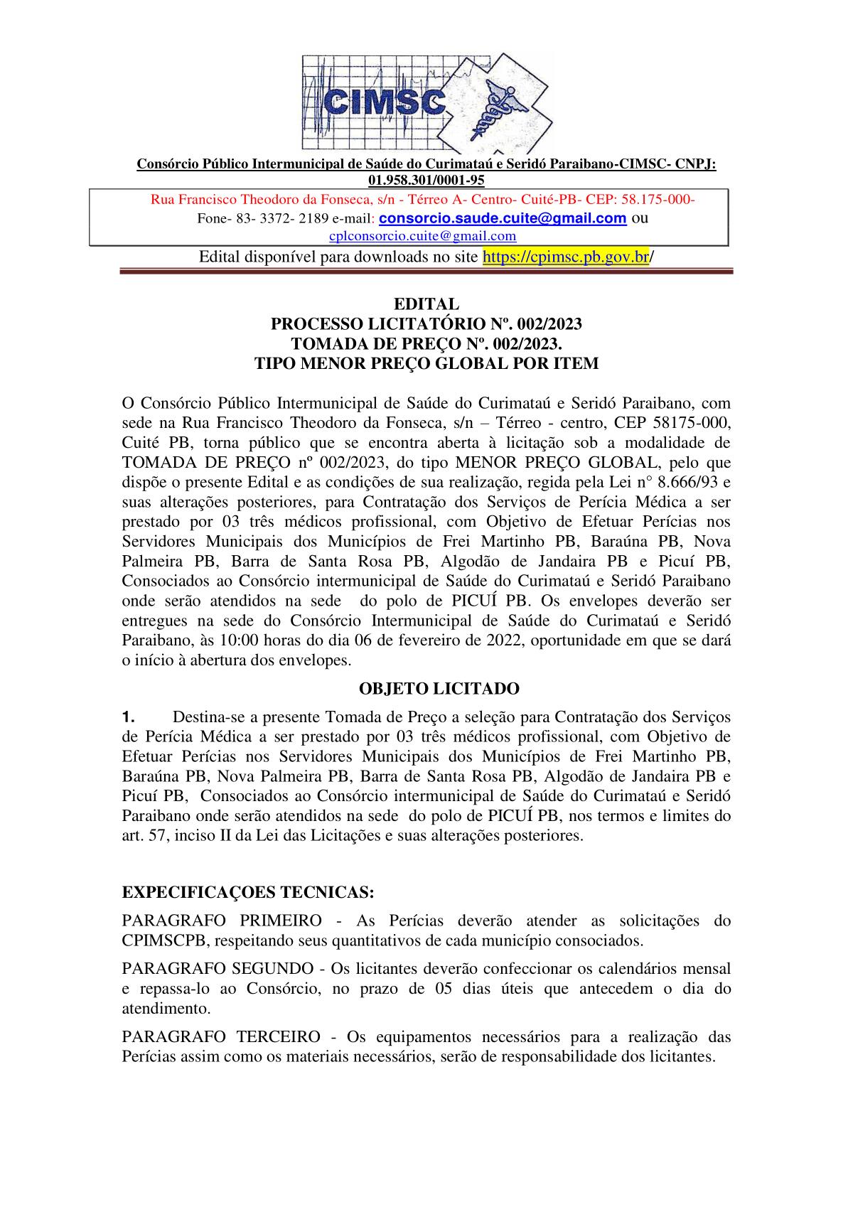 EDITAL PROCESSO LICITATÓRIO Nº. 002/2023 TOMADA DE PREÇO Nº. 002/2023.
