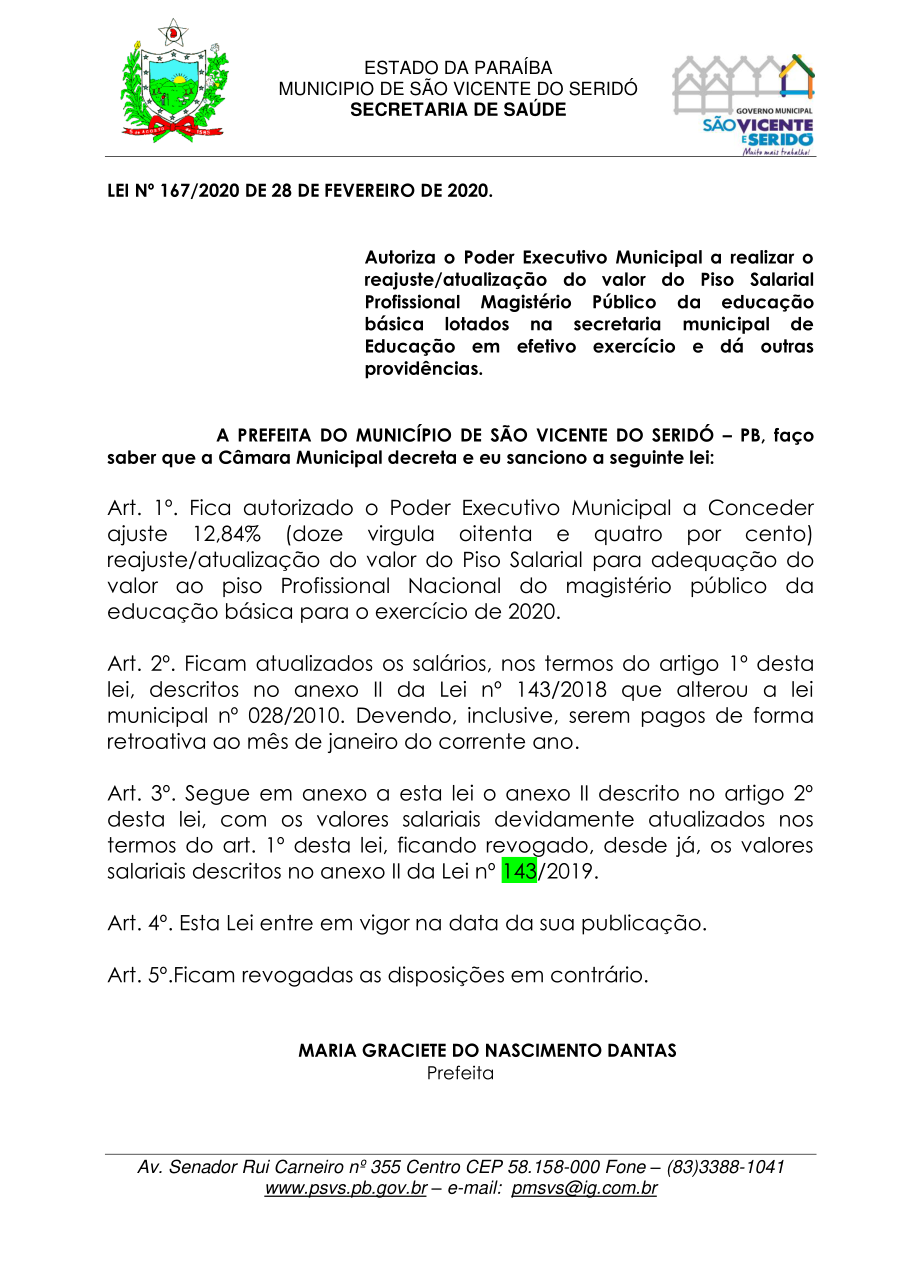 LEI 167/2020 - Estima a Receita e Fixa a Despesa do Município de São Vicente do Seridó para o Exercício de 2020